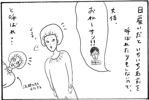 サイゾーウーマンカルチャーマンガ柿ノ種まきこ『アラサー独身女、今日も日雇いで生きてます』日雇い現場での呼び方問題 カルチャー 【連載】柿ノ種まきこ『アラサー独身女、今日も日雇いで生きてます』 【日雇いマンガ】37話『君の名は〜性別を超える作業服マジック〜』 2019/03/07 13:00 サイゾーウーマン編集部(@cyzowoman) マンガ柿ノ種まき子日雇い ――「キツイ」「汚い」「男臭い」……なんとなく近寄りがたいイメージのある“日雇労働”。その、実態はどのようなものなのか? 日雇い労働を生業とするアラサー・柿ノ種まきこが、日雇いの日々と人間模様を紹介します。 第37話『君の名は〜性別を超える作業服マジック〜』 工場関係の日雇いなどは、全身が隠されたマスク姿になります。 そのため、名前を呼ばれるというよりは、雰囲気で呼ばれることが多いです。 「おばさん!」と呼ばれるとちょっとカチンときそうですが、「おかーさん!」だと、ちょっとオブラートに包まれてていいかな。 いつまでお姉さんと呼んでいただけるのか……どきどきです。 ――毎週、木曜日に最新話を更新。次回38話は年3月14日(木)の更新予定です。 柿ノ種まきこ/@kakinotane_makiko 日雇いをしながらマンガを描くアラサー。過去には、「iVERY」にて婚活マンガ『女もつらいよ』を連載。現在はインスタグラムにて、マンガを不定期投稿。 https://www.instagram.com/kakinotane_makiko/ 最終更新:2019/03/07 13:00 いっそ記号とかで呼んでくれればだれも傷つかないのにね。 関連記事 【日雇いマンガ】『アラサー独身女、今日も日雇いで生きてます』【15~21話まとめ読み】【日雇いマンガ】『アラサー独身女、今日も日雇いで生きてます』【8~14話まとめ読み】【日雇いマンガ】『アラサー独身女、今日も日雇いで生きてます』【1~7話まとめ読み】【日雇いマンガ】36話『ライン(作業)だョ! 全員集合。◯◯フェチおすすめ現場』【日雇いマンガ】30話『チャームポイントはツインテール!? ベテランおばさん観察日記1』 その他の作品を読むバックナンバーを読む 次の記事 関ジャニ∞・丸山、“美人局”にあう可能性大!? >