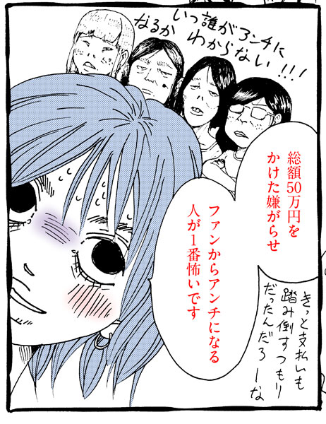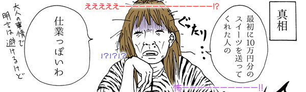 サイゾーウーマンカルチャーマンガあさの☆ひかり『ネット配信で人生が狂った人の裏側ぶっちゃけていいスか!?』【26話】50万円のスイーツ事件簿! カルチャー 【マンガ連載】ネット配信で人生が狂った人の裏側ぶっちゃけていいスか!? 【配信者マンガ】「50万円分」のスイーツ事件簿! 嫌がらせの犯人は…?【第26回】 2019/04/20 13:00 あさの☆ひかり マンガあさの☆ひかりネット配信で人生が狂った人の裏側ぶっちゃけていいスか!? 配送先をたどるも… ――毎週土曜に、最新話を更新。次回をお楽しみに! あさの☆ひかり 10月3日生まれ。東京都出身。 グラビアアイドルとして活動したのち、エッセイマンガ家として多数の作品を発表。潜入取材を得意とし、社会の裏側からサブカル、芸能界まで幅広いネタをマンガにしている。 既刊に『芸能界の裏側ぶっちゃけていいスか!? 三十路グラドルのつぶやき』(ぶんか社)『何度か消されかけましたが、こりずに芸能界の裏側ぶっちゃけていいスか!? 』(同)など。 ◎あさの☆ひかりTwitter https://twitter.com/asano_hikali <バックナンバーはこちら> ■第1回~第4回・まとめ読み ■第5回~第8回・まとめ読み ■第9回~第12回・まとめ読み ■第13回~第16回・まとめ読み ■第17回~第20回・まとめ読み ■第21回~第24回・まとめ読み ■第25回…三十路アイドル、「パンツ売り」で一攫千金!? 前のページ12 最終更新:2019/04/20 13:00 Amazon 芸能界の裏側ぶっちゃけていいスか!? 三十路グラドルのつぶやき 可愛さ余って…ってヤツ! 関連記事 【マンガ・ヤリマン引退】娘2歳、なんでもヤリたいお年頃……汚いモノは綺麗にしましょ!?【第42回】【日雇いマンガ】43話『若さという名の暴力〜キラキラ女子大生質問攻めの乱〜』【マンガ・ヤリマン引退】私、だから筋トレできないんです!? ヤリママの言い訳【第41回】【マンガ】「ピル太り」実録レポート! 生活を変えてないのに、みるみる体重が増えていく【第57回】【毒親支配マンガ】「まさか浮気?」彼の誕生日、何度もかかってくる電話。その相手は……【6話】 その他の作品を読むバックナンバーを読む 次の記事 BTSのウラでK-POPスターの凋落 >
