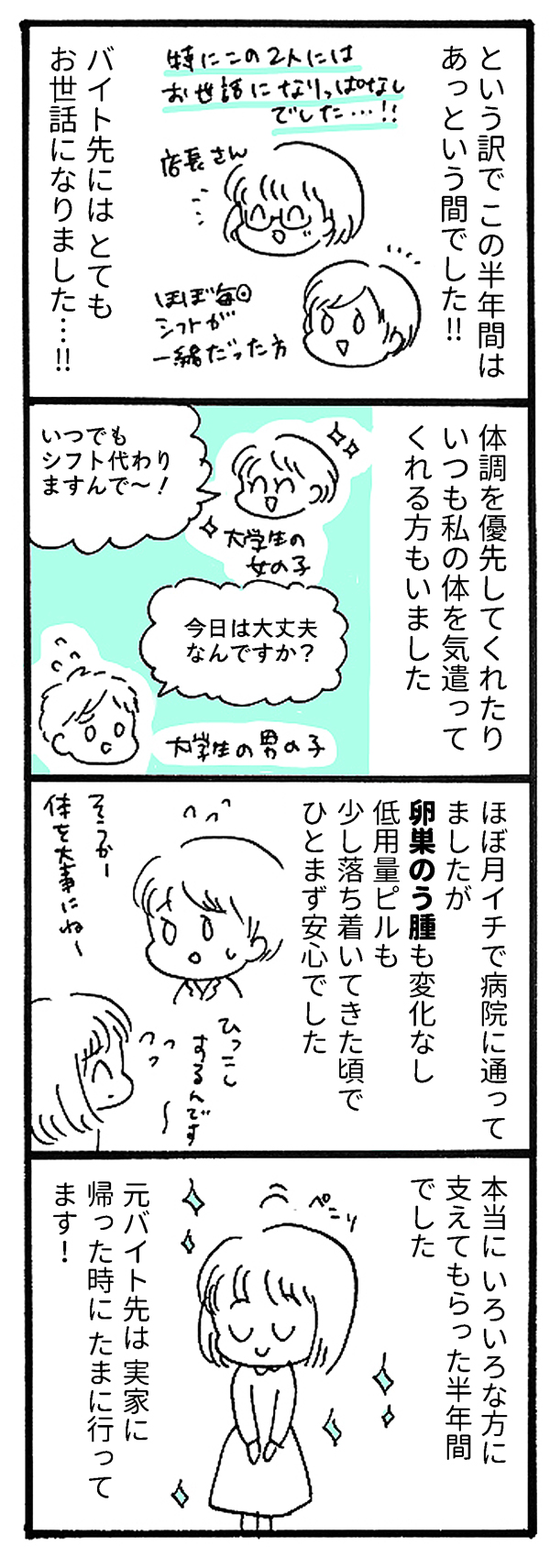 サイゾーウーマンカルチャーマンガ【63回】半年で「卵巣のう腫」は…… カルチャー 【連載】私の生理、「病名」がつきました。~月経困難症、ピルに漢方あれこれ5年試してみたら~ 【マンガ】半年間で「卵巣のう腫」はどうなった? 実家暮らしと「バイト生活」を終えて【第63回】 2019/05/07 18:00 まお マンガ私の生理、「病名」がつきました。月経困難症 「生理痛なんて、みんな一緒!」 1カ月ごとにやってくる、尋常じゃない腹痛・寒気・吐き気……。 周囲の言葉を信じて10数年も耐え続けた「生理痛」、医者にかかってみたらビョーキと診断されちゃった!? 30歳から治療を開始した「月経困難症」との向き合い方をつづる、日常闘病コミックエッセイ。 半年間の実家暮らし、終了 ――「私の生理、病名がつきました。」は、毎週日・月・火の週3回更新になります。お楽しみに! <著者プロフィール> まお 月経困難症。体験した事や思った事を4コマ漫画にしています。自分の体、大切な人の体を考える事や、行動する事のきっかけになればうれしいです。ポジティブに生きてるオタク。 <バックナンバーはこちら> ■第1回~第10回まとめ読み……私の生理、ビョーキでした!? ■第11回~第20回まとめ読み……ピル服用、7カ月の間に起きたこと ■第21回~第30回まとめ読み……ピル服用で「不正出血」が止まらない!? ■第31回~第40回まとめ読み……「生理を知らない成人男性」って実在したの!? ■第41回~第50回まとめ読み……卵巣に「のう腫」が見つかったらどうする? 【第51回】新しい職場で大寝坊! 【第52回】30代で更年期障害!? 【第53回】ピル由来と思しき「新たな症状」 【第54回】3度めの「低容量ピル」 【第55回】「不正出血」が起きたワケ 【第56回】ピルを飲むと太るって本当? 【第57回】「ピル太り」実録レポート! 【第58回】ピル太りに効いたダイエット方法 【第59回】自己管理できない人、じゃない! 【第60回】初めて知った「太った人」の辛さ 【第61回】「心無い言葉」への対処法 【第62回】引越し先、選ぶ基準は○○への距離! 最終更新:2019/05/07 18:00 Amazon 生理ちゃん 充実した半年だったよね 関連記事 【31~40話】ヤリマン引退!~マンを持して育児はじめました~【マンガ・まとめ読み】【21~30話】ヤリマン引退!~マンを持して育児はじめました~【マンガ・まとめ読み】【月経困難症マンガ】卵巣に「のう腫」が見つかったらどうする?【第41回~第50回まとめ読み】【毒親支配マンガ】結婚の挨拶、いよいよ義母と初対面! 私の印象良くないよね……?【10話】【月経困難症マンガ】「生理を知らない成人男性」って実在したの!?【第31回~第40回まとめ読み】 その他の作品を読む 次の記事 嵐・二宮和也、独特の“旅行観” >