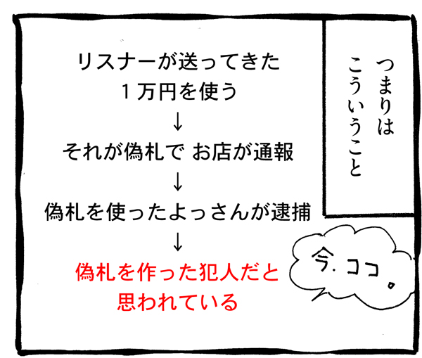 サイゾーウーマンカルチャーマンガあさの☆ひかり『ネット配信で人生が狂った人の裏側ぶっちゃけていいスか!?』【32話】タカリ配信者、ニセ札を使用! カルチャー 【マンガ連載】ネット配信で人生が狂った人の裏側ぶっちゃけていいスか!? 【配信者マンガ】 ある日突然「ニセ札使用」で捕まった!? 「通貨偽造」のコワ~イ話【第32回】 2019/06/08 13:00 あさの☆ひかり マンガあさの☆ひかりネット配信で人生が狂った人の裏側ぶっちゃけていいスか!? なぜ「通貨偽造」かと言うと… ――毎週土曜に、最新話を更新。次回をお楽しみに! ⇒このマンガへのコメントを読む・書く あさの☆ひかり 10月3日生まれ。東京都出身。 グラビアアイドルとして活動したのち、エッセイマンガ家として多数の作品を発表。潜入取材を得意とし、社会の裏側からサブカル、芸能界まで幅広いネタをマンガにしている。 既刊に『芸能界の裏側ぶっちゃけていいスか!? 三十路グラドルのつぶやき』(ぶんか社)『何度か消されかけましたが、こりずに芸能界の裏側ぶっちゃけていいスか!? 』(同)など。 ◎あさの☆ひかりTwitter https://twitter.com/asano_hikali <バックナンバーはこちら> ■第1回~第4回・まとめ読み ■第5回~第8回・まとめ読み ■第9回~第12回・まとめ読み ■第13回~第16回・まとめ読み ■第17回~第20回・まとめ読み ■第21回~第24回・まとめ読み ■第25回~第28回・まとめ読み ■第29回…AV女優が生配信でハニトラ!? ■第30回…オカマは七転び八起き ■第31回…ネットストーカー恐怖譚 前のページ12 最終更新:2019/06/08 13:00 Amazon 芸能界の裏側ぶっちゃけていいスか!? 三十路グラドルのつぶやき よっさん全然こりてないやんけ! 関連記事 【ジャニーズマンガ】掃除のおじさんがヅャニーさん!?【『ヅャニーさん』第80回】【マンガ・ヤリマン引退】「シーツ交換」でかくし芸!? あの芸能人が降臨!【第52回】【日雇いマンガ】50話『スメルハラスメント発生! 解決策でさらなる地獄化……』【マンガ・スピリチュアル被害】「ついてる」と1,000回言うだけで幸せになる団体【3回】【マンガ・ヤリマン引退】「オブラートに包んだ発言」を2歳児に教えたらどうなる?【第51回】 その他の作品を読むバックナンバーを読む 次の記事 人命救助で株が上がった有名人 >