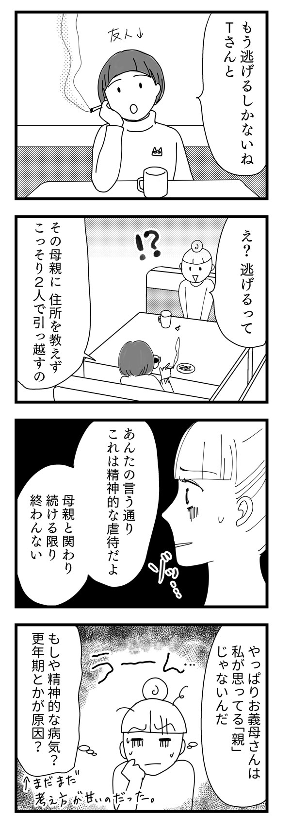 サイゾーウーマンカルチャーマンガ音咲椿『婚約破棄で訴えてやる!~毒親持ち彼氏と167日間壮絶バトル~』【毒親30話】もう逃げるしかないね カルチャー 【マンガ】私の彼が毒親から逃れられない!~婚約破棄で訴えてやる・番外編~ 【毒親マンガ】「もう逃げるしかないね」精神的な”虐待”と友人に指摘されて…どうする!?【30話】 2019/07/09 14:00 音咲椿 マンガ毒親音咲椿婚約破棄で訴えてやる! 「君ってなんだか、僕の母に似てるんだよね」――。 イケメン彼氏の「不可解」な婚約破棄と、それに伴う顛末を描いた実録コミックエッセイ 『婚約破棄で訴えてやる!~毒親持ち彼氏と167日間壮絶バトル~』の前日談。 婚約していた彼は、なぜ突然手のひらを返したのか? あんなに嫌悪していたはずの“毒母”側についたのはどうして? 交際していた当時の記憶から あの頃の彼の心理と背景を掘り下げてみると、意外な事実が見えてきた――! 逃げるしかないね ――『私の彼が毒親から逃れられない!』は毎週月・火更新。お楽しみに! ⇒このマンガへのコメントを読む・書く <バックナンバーはこちら> ■第1回……婚約破棄から10年、残る疑問 ■第2回……彼のママは専業主婦だった ■第3回……「辞表出しといた」って!? ■第4回……我が子にセックス回数を暴露!? ■第5回……実家暮らしだった彼と、恋に落ちるまで ■第6回……彼の誕生日に、何度も電話が……。 ■第7回……彼母の「息子依存」が過剰すぎる? ■第8回……朝4時、彼は電話で謝罪中 ■第9回……バツイチの私、義母からの印象は? ■第10回…いよいよ彼母と初対面の日 ■第11回…初めて会った彼母は……! ■第12回…「過去の彼女」と比較された ■第13回…彼母に受け入れられた……! ■第14回…「君は、僕の母に似てるね」 ■第15回…両家の顔合わせも上々で…? ■第16回…実家とアパートを往復する彼 ■第17回…母に「汚い」って言われたんだ ■第18回…母にエロ原稿を見られた ■第19回…実母に「クズ」と罵られた ■第20回…我が子の仕事を否定 ■第21回…彼母の抱える「トラウマ」 ■第22回…「月5万払え」って!? ■第23回…月イチで「毒親被害」に遭う彼 ■第24回…DVの構造そっくり! ■第25回…彼の努力が報われた! ■第26回…印税が入ってくる! ■第27回…印税を毒母に渡したら ■第28回…「恥知らず」の「汚れたカネ」 ■第29回…彼母は普通の親じゃない? ■前作……『婚約破棄で訴えてやる!』1-3話 *** 前作『婚約破棄で訴えてやる!』は、電子書籍にてすべてご覧いただけます。 ★★★各電子書店にてお買い求めいただけます★★★ 音咲椿(おとさき・つばき) 男性向けグラビア誌編集長を経て、ポット出版社刊「女の子×女の子のためのエロチックブック・Carmilla」にてイラスト・漫画家デビュー。 単行本「イケメン外国人たちとベッドで異文化交流した結果。」(ぶんか社刊)好評発売・配信中。 マンガ「『こんな大きいなんて聞いてない!』~外国人と異文化SEX、ヤりまくりました。」「婚約破棄で訴えてやる!~毒親持ち彼氏と167日間壮絶バトル~」配信中。 音咲椿Twitter(@otosaki6666) 最終更新:2019/07/09 14:08 楽天 音咲椿 客観的な視点って刺さるよね 関連記事 【マンガ】私の彼が毒親から逃れられない! ~婚約破棄で訴えてやる・番外編~【新連載】【マンガ】元スタッフが暴露……漢方薬の「ヤバすぎる中身」!【第74回】【配信者マンガ】「会いたいです」視聴者からの珍しい要望――彼は「末期がん」だった【第35回】【マンガ・ヤリマン引退】産後のママへの「注意喚起」! 数年ぶりのオモチャ遊びにご用心【第59回】【日雇いマンガ】54話『どっちがタイプ!? ピュアボーイが翻弄される魔性の現場』 その他の作品を読むバックナンバーを読む 次の記事 “パパ活”アイドル・まろか、批判にも「言ってろ」 >
