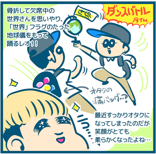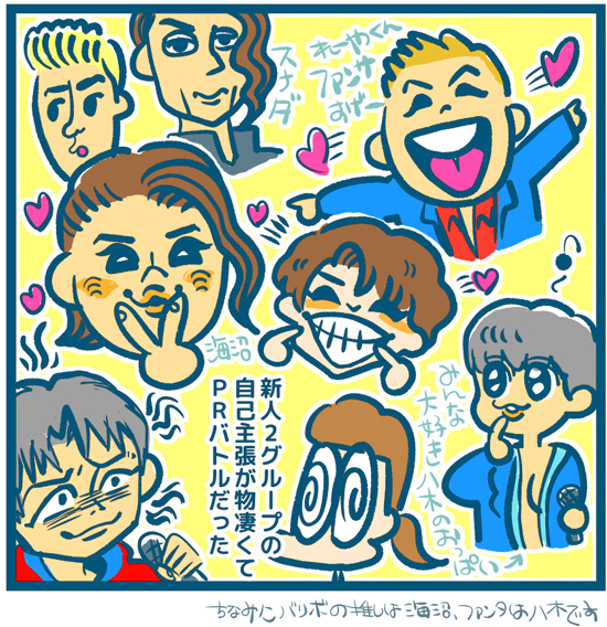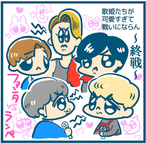 サイゾーウーマンカルチャーマンガLDH若手の奇祭『BATTLE OF TOKYO』 カルチャー えるたまのアイドル自由帳 第64回 【マンガ】「Jr.EXILE」ってジャニーズJr.みたいな? LDH若手の奇祭『BATTLE OF TOKYO』 2019/08/05 15:41 えるたま えるたまのアイドル自由帳 歌姫たちが可愛いすぎて戦いにならない ※1枚絵でも閲覧できます(1)(2)(3) <イベント詳細> 『BATTLE OF TOKYO ~ENTER THE Jr.EXILE~』 日時:7月4日〜7日 場所:幕張メッセ 国際展示場ホール 三代目J SOUL BROTHERSより下の世代を「Jr.EXILE」と命名し、 新たなプロジェクトを始動したLDH。 その最初のイベントとして用意されたのがこの幕張メッセ怒涛の4DAYS公演ライブだ。GENERATIONS from EXILE TRIBE、THE RAMPAGE from EXILE TRIBE、FANTASTICS from EXILE TRIBE、BALLISTIK BOYZ from EXILE TRIBEの4組の若手たちがバッチバチにぶつかり合う熱いステ ージが繰り広げられた。東京が3つある? みたいな設定があるらしいが、詳細は不明。ところで、BALLISTIK BOYZ from EXILE TRIBEは、同事務所に所属のDOBERMAN INFINITYとHIROさんの共同プロデュースなわけだが、 このDOBERMAN INFINITYには「from EXILE TRIBE」が付いていない。 なんだか将軍家に子どもをとられる側室みがある! DOBERMAN INFINITYにも注目だ! <お知らせ> 「えるたまのアイドル自由帳」新シリーズ「オタク駆け込み煩悩寺」始動! 人様のオタクっぷりをえるたまさんがマンガにします(不定期)。推しへの愛をマンガにしてほしい方、熱い追っかけエピソードをお持ちの方、もしくは実際にアイドル・アーティストとして活動されてる方(及びマネージャーさん)がいらっしゃいましたら、どしどしえるたまさんのTwitter( https://twitter.com/L_tama)へリプライをください。(採用するか否かは編集部と相談のうえ決定いたしますので、必ずしもマンガになるわけではありません。何卒ご了承ください) えるたま 東京生まれロキノン育ち今はアイドルのATM。マンガ家・イラストルポライター。 ブログ( http://onolcy.blog.fc2.com/ ) ツイッター( https://twitter.com/L_tama ) 前のページ123 最終更新:2020/02/10 14:00 Yahoo (おまけ付)2019.07.03発売 BATTLE OF TOKYO ~ENTER THE Jr.EXILE~ / GENERATIONS/RAMPAGE/FANTASTICS/BALLISTIK BOYZ from EXILE TRIBE (CD+DVD) RZCD86861-SK 『ジャニーズJr.祭り』みたいなこと? 関連記事 【マンガ】ジャニーズ、バーチャル進出で大ヒット!? “あすかな”にハマったド新規が見た「正しさ」【マンガ】タッキーの神の一手か愚策か? ジャニーズJr.・Snow Man増員でファンが見た地獄と希望【マンガ】平野紫耀はアイドル最終兵器キメラである――LDH・K-POPオタを唸らせるKing&Prince【アイドル自由帳:59回】スタダ、LDH、K-POPの若手3グループ集結……! 子どもと筋肉とドーランにひれ伏した!K-POPは空前の「日本人アイドル」バブル! NCT、PENTAGONら逆輸入イケメンを青田買い その他の作品を読む 次の記事 関ジャニ∞、ピー音だらけの冠番組 >