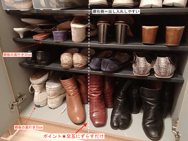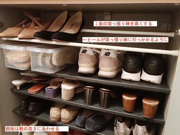 サイゾーウーマン暮らし住まい下駄箱収納を救う100均テクニック 暮らし 伊藤まきの「お片付けSOS」相談! 「下駄箱」収納を救う、100均テクニック! ダイソーのアレと突っ張り棒で「イラつき」解消! 2019/10/14 19:00 伊藤まき 100均「お片付け・お掃除SOS」伊藤まき Step2:[靴の入れ方]を正す! 靴を交互にずらせば、収納力アップ! [After 下段] 奥行きの深い棚なら、ずらすだけ! 下駄箱にも規格サイズがあるため、どの家も似ています。一般的には、可動型の棚板(プラスチック製)が数枚あって、下段の奥行きが深くなっています。ここに、高さのある靴を入れます。通常は揃えて入れる靴を斜めにずらすだけで、収納できる数が4足から6足にアップしました。 Step3:[棚板の高さ]を調整! 100均「突っ張り棒2本」で激変 [After 上段] 100均の「突っ張り棒2本」で、収納力UP 靴に合わせて「棚板の高さ」を調整すれば、収納力が増えます。Mさん宅も棚板の調整により、最上部にスペースが空きました。ここに、「突っ張り棒2本」を設置します。今回は、ヒールが引っかかるように奥を高くしました。これで、出し入れもスムーズになります。 マイホームなら型番を控えて、「棚板の追加購入」をオススメします。シューズケースやホルダーを増やすより、「棚板」の数を整えるほうが、使いやすい下駄箱に変わります。 次のページ [After]余裕のある下駄箱に変身! 前のページ12345次のページ Yahoo 突っ張り棒 つっぱり棒 多機能つっぱり棒 強力 カーテン つっぱり棒 浴室用ステンレス伸縮棒 (70-120 cm) 関連記事 セリアの100円グッズで、ランドリーラックのイライラ「隙間」を快適収納にアップ!100均「プラダン」で激変! 洗濯機、ホコリまみれの「防水パン」が3ステップで収納空間に【100均の収納アイテム・DIYグッズ】おすすめアイテム27選!【ダイソー・セリア・キャンドゥ・ワッツ】「押入れ収納ケース」は買ってはいけない!? 使いやすくて湿気も溜まらない「○○用」が正解!買って損なし「ニトリのカラボ」最強説! キッチンカウンターから絵本棚まで“激安”対応