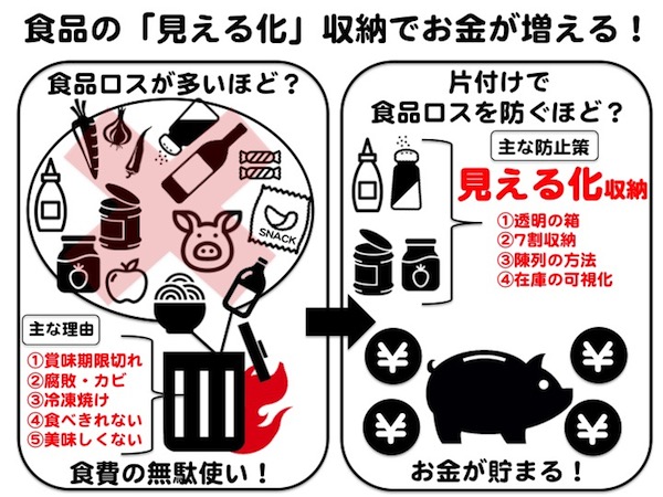 サイゾーウーマン収納ライター・ito maki「30代女子『煩悩部屋』ビフォーアフター」100均「透明ボックス」収納で“賞味期限切れ”一掃! 食品ストック癖は年8万円のムダだった 暮らし 伊藤まきの「お片付けSOS」相談! 100均「透明ボックス」収納で“賞味期限切れ”一掃! 食品ストック癖は年8万円のムダだった 2019/12/23 19:30 伊藤まき(収納ライター) 「お片付け・お掃除SOS」伊藤まき 日本人の多くが、1年間に「8万円」をゴミ箱へ!? 国が発表する「食品ロス」問題を、上に表しました。自身の目で現実を実感するなら、食品庫&冷蔵庫にあるモノをぜんぶ出してみてください。驚くほど、食費の無駄使い(=食品ロス)が見えます。それもそのはず、家庭から廃棄される「食品ロス」の量を米の消費量※に換算すると、1年間で約8〜10万円分相当(4人家族の場合)になるそう。日本の家計における食費は、消費支出の4分の1を占めるため貯蓄に大きく影響するのです。※平成28年度推計(農林水産省・環境省) 「見える化」収納で、食費の「無駄使い」を防ぐ! 「食品ロス」を減らして「貯蓄」に回せば、時間と精神の余裕が生まれ「運気UP」が望めます。でもどうやって「食品ロス」を防ぐの? 食費の予算を決めて、節約と自炊を心がけるはもちろんだけど……実際は、料理の時短や手間を考えると難しいよね? そんな方こそ、「食品の片付け」が効きます。 保管するモノが一定ではない「食品庫」「冷蔵庫」にも、モノ(食品)の住所が必要です。まずは、整理収納の基本ステップ! 中の食品を「ぜんぶ出す→種類別に分類する→不要を取り出す」の作業をします。空になった空間を一掃したら、寸法を測ります。 実際に、Aさん宅の食品庫を「見える化」収納に改善してみました。 次のページ 食品収納は「透明のボックス」を選ぶべし! 前のページ123次のページ 楽天 「食品ロス」をなくしたら1か月5、000円の得! 関連記事 買ってはいけない「100均」グッズ! 下駄箱で“地雷化”する靴収納アイテム、正解はコレプロが選ぶ「セリア」3アイテム! キッチン収納、間違いない“使える”お片付けテク100均「冷蔵庫ミニポケット」が“洗面台”で超活躍! 朝の身支度の「イラッ!」を解決100均グッズで「深型引き出し」収納を極める! 書類・小物・薬のゴチャつき整理術「無印良品」のファイルが正解! 調味料・食品の“ムダなし”簡単収納テクニック