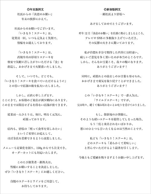 サイゾーウーマンカルチャーインタビューいきステ社長メッセージを校正者が斬る カルチャー インタビュー 「いきなり!ステーキ」社長メッセージが反発呼ぶワケ――校正者が「客を追い返す文章」と一刀両断 2020/02/02 16:00 サイゾーウーマン編集部(@cyzowoman) インタビュー 「いきなり!ステーキ」社長直筆メッセージを校正者がリライト! まずA氏は、「社長の原文を極力生かす」という方針で、どんどんと赤字を入れていき、次のようなリライト文を仕上げた。 ※クリックで拡大表示 問題視されていた「上から目線」はだいぶ解消されたものの、A氏は「それでもやはり『耳なし芳一』問題が解消されませんね……」と赤ペンを離さない。再度、「文量を少なくすること」を念頭に文章を整えていく。 次のページ 「いきなり!ステーキ」社長メッセージにさらに手を加えると…… 前のページ12345次のページ 楽天 いきなり!ステーキ 関連記事 TOKIO山口・ジャニーズの公式文書に「あ然とした」! “言葉のプロ・校正者”が辛口ツッコミ「新潮45」大炎上! 新潮社社長“声明文”のおかしな点を、言葉のプロ・校正者が徹底解読「セブン-イレブン」「ZOZO」「RIZAP」……2019年、企業スキャンダルの“主役”たちを考察!ZARAが抱える2つの地雷――「日本ではユニクロに勝てない?」「パクリ問題連発」好調の裏側ユニクロで「買って損したもの」を100人調査! 「色落ちする黒パンツ」「毛玉だらけのコート」