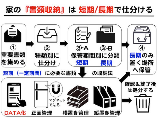サイゾーウーマン暮らし住まい「書類整理」の極意を伝授 暮らし [連載]30代女子の「煩悩部屋」ビフォーアフター テレワークと家計を楽にする「書類整理」の極意を伝授! 家中をスッキリ保つ 7つのポイント! 2020/04/27 19:30 サイゾーウーマン編集部(@cyzowoman) 「汚部屋」ビフォーアフター [ポイント.3]レシートは、いつまで保管? [筆者宅例] 毎日お財布からレシートを出して仕分け 個人事業主の場合、確定申告のため5〜7年の保管が必要です。家計簿を付ける家なら[収入・支出]を記録するまで保管。一般的には、レシートに記載された返品と交換期限(平均1〜4週間)まで持つと安心です。毎日のレシート整理(お金の動きを確認する習慣)が、無駄使いの見直しにも役立ちます。 [ポイント.4]家の「重要書類」を仕分ける4つのステップ 次に、仕分け方(4つのステップ)を説明します。もちろん、住人の性格や収納家具によっても変わります。基本的には、「入れるだけ」「挟むだけ」などワンアクションで済むようにまとめます。 [1]重要書類を1カ所(トレーなど)に集める [2]種類別(契約書関係など)に仕分けする [3]保管期間別(短期/長期)に分ける [3A]短期の保管……DATA化、貼る、箱に入れるなど [3B]長期の保管……ドキュメントorクリアファイルに挟む [4]置く場所(住所を決める)に保管する 筆者宅の例(収納法)を使って、よりわかりやすく説明していきます。 次のページ [ステップ.1]100均のA4型トレイに「重要書類 前のページ12345678次のページ Yahoo マグネットクリップ 強力冷蔵庫マグネット Idana 12枚セット磁石クリップ マグネットピン 磁気クリップ ステンレスクリップ 多目的 キッチン/オ 関連記事 汚部屋30女はレシートまみれ!? ゴミと書類をかき分けて「キッチンカウンター」を発掘! セリアで買うべき「収納ボックス」はコレ! 汚部屋30女の汚台所が見違える白さにキャンドゥの“アレ”は無印良品にそっくり!? 汚部屋30女のキッチン収納を400円で解決今こそ除菌掃除! プロが伝授「オキシクリーン」で汚れゴッソリ、キッチン・浴室丸ごと掃除術間違えがちな「ダメな収納」、整理したのに片付かない! イライラ防ぐ3つのコツとは?