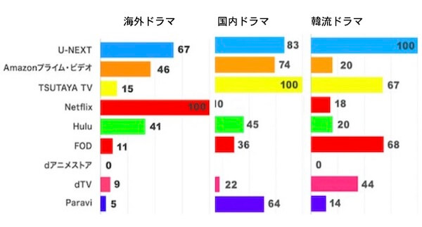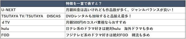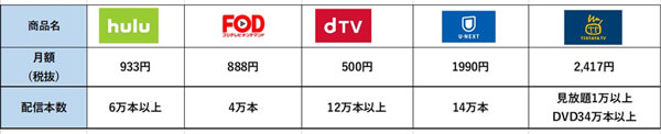 サイゾーウーマン暮らしトレンド人気の動画配信(VOD)サービス5選を比較!【Hulu・dTV・U-NEXT・FOD・TSUTAYA TV/TSUTAYA DISCAS】 PR 人気の動画配信(VOD)サービス5選を比較!【Hulu・dTV・U-NEXT・FOD・TSUTAYA TV/TSUTAYA DISCAS】 2020/05/01 15:00 サイゾーウーマン編集部(@cyzowoman) 近年、動画配信(VOD)サービスが増加しているものの、どれを選んでいいのか迷う方もいるのでは? 今回は、作品数や料金、動画以外のサービス内容など5つの点から、人気のVOD各社を比較していきます。 1:作品数、料金 VOD各社で月額料金は大きく変わります。配信本数もまったく違うので、しっかりチェックしておきましょう。 dTVとTSUTAYA TV/TSUTA DISCASでは、その差1,917円。配信本数に目を向けると、FODとU-NEXTで10万本も違います。 特徴的なのはTSUTAYA TV/TSUTAYA DISCAS。動画本数は1万本ですが、DVDのレンタルもできるレンタルできるDVDは34万本以上。DVDは自宅に宅配してくれます。 2:国内ドラマ、海外ドラマ、 韓流ドラマなどジャンル別本数の比較 人気の海外ドラマや見逃した国内ドラマをチェックするならVODが便利ですよね。各社の比較本数から、今回はhulu、FOD、U-NEXT、TSUTAYA TV/TSUTAYA DISCAS、dTVに注目してみます。 (※GEM Partners株式会社調べ。2020年3月時点) ■海外ドラマ 海外ドラマはVODサービスの中で一番人気のジャンルですよね。どこのVODもそれぞれ力を入れています。Huluは新作海外ドラマの配信スピードが評価されているよう。U-NEXTは配信本数の多さが圧倒的です。 ■国内ドラマ VODサービスごとに提携しているテレビ局は異なります。Huluは日本テレビ、FODはフジテレビと、それぞれ強みがあるんです。一方、U-NEXTは全局のドラマを取り揃えているだけでなく、他VOD(NHKオンデマンドを除く)では配信していないNHKまで視聴できるのが魅力。 それぞれ特性が異なるので、自分の興味に合わせて選びましょう。 ■韓流ドラマ 韓国ドラマ配信数はU-NEXTがトップ。他VODのおよそ3倍以上という圧倒的な数字です。韓流ドラマが好きな人はU-NEXTに入れば間違いないと言えるでしょう。 国内ドラマも海外ドラマも扱いが多く韓流までカバーしているU-NEXTはドラマ好きには最もオススメですね。好きなドラマが特定のテレビ局 多い人は、HuluやFODを選択するのもいいでしょう。 3:映画の本数の比較 VODの一番の魅力は、なんといっても映画。各社とも映画ジャンルに力を入れていますが、配信本数でみるとかなりの差がありました。 (※GEM Partners株式会社調べ。2020年3月時点) ■洋画 VOD各社の中では、U-NEXTが飛び抜けています。洋画好きはU-NEXTを選ぶのが正解かもしれません。一方、国内ドラマが比較的強かったHuluも洋画ジャンルは以外と少ないんですね。各社の強みを把握して選ぶことが大事ですね。 ■邦画 邦画でも配信本数トップはU-NEXTという結果に。dTVのおよそ5倍という圧倒的な本数です。洋画、邦画問わずに映画好きを満足させてくれるのはU-NEXTのようです。 4:利用アカウント数、無料期間の比較 VOD各社で、利用できるアカウント数や無料トライアル期間が異なります。 ■アカウントは最大6つ dTVは月額500円、FODは月額888円とお手頃ですが、別アカウントは使えません。家族それぞれで所有したい場合は、6アカウントまで作れるHuluや4つ作れるU-NEXTがベストでしょう。 ■オフライン視聴 自宅などのwi-fi環境であらかじめ番組をダウンロードしておいて、外出先で楽しむ「オフライン視聴」。対応しているのはhulu、dTV、U-NEXTの3社です。 ■無料トライアルは最大31日間 各社とも無料期間を設けていますが、huluとFODは2週間と短め。他VODは30~31日間とたっぷり楽しめます。またU-NEXTは、無料トライアルでも600円分のポイントが付与されるのが特徴。ポイントで有料の最新タイトルを視聴できます。気になったら、ぜひ無料トライアルに登録してみてください(※リンク)。 5:各サービスの特徴 VOD各社の特徴的なサービスや人気タイトルをチェックしてみましょう。 ■U-NEXT ・コンテンツ:毎月付与のポイント(1,200ポイント)で有料タイトルの視聴や映画館での割引ポイントに利用できます! また、動画サービスだけでなく、追加料金なしで70誌以上の雑誌がいつでも読み放題なのも魅力ですね。 ・人気タイトル:『キム秘書はいったい、なぜ?』『スターウォーズ』『鬼滅の刃』 ■TSUTAYA TV/TSUTAYA DISCAS ・動画見放題+DVD宅配レンタルサービス。定額レンタル8プランでは、動画見放題に加え最新作も含めた月間8枚DVDレンタル可能+旧作であれば借り放題! 動画配信サービスでは視聴できないジブリ作品等もDVDのレンタルで視聴できちゃいます! ・人気タイトル:『噓を愛する女』『あやしいパートナー~Destiny Lovers~』『TED』 ■dTV ・コンテンツ:エイベックス通信放送が運営していることもあり、avex関連のコンテンツが多く、音楽ジャンルを中心に観たい人にはオススメ! ・人気タイトル:『キスマイどきどきーん!』『名探偵コナン』『不滅の恋人』 ■Hulu ・コンテンツ:海外ドラマの最速配信(FOXチャンネル)や国内ドラマ(日テレ