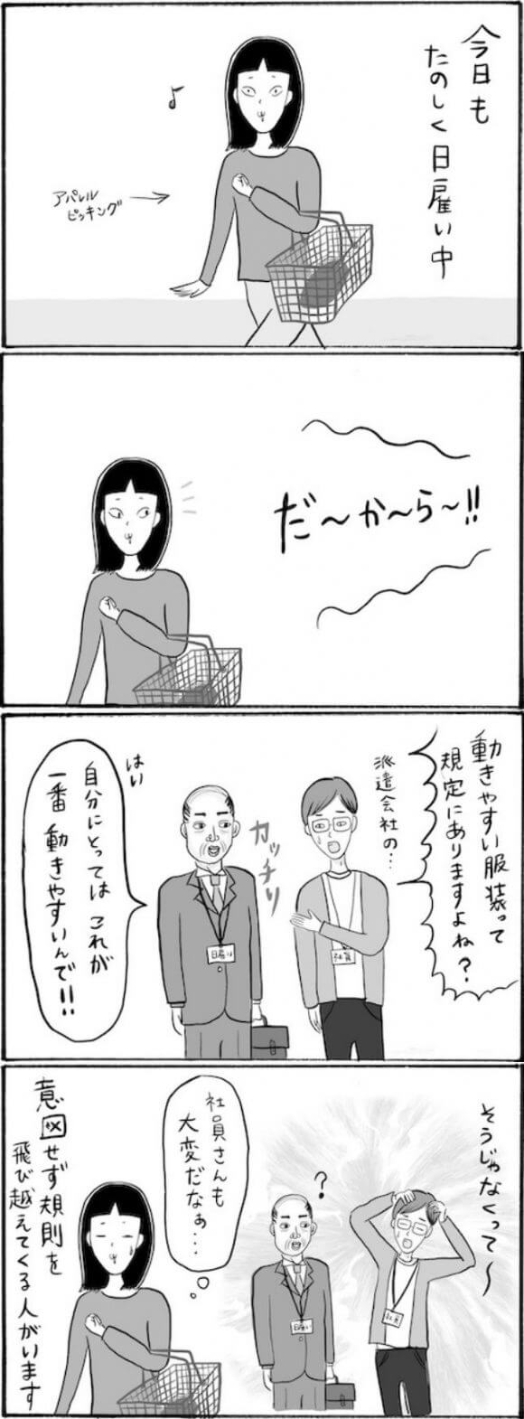 サイゾーウーマンカルチャーマンガ柿ノ種まきこ『アラサー独身女、今日も日雇いで生きてます』【日雇いマンガ】92~98話 カルチャー 【連載】柿ノ種まきこ『アラサー独身女、今日も日雇いで生きてます』 【日雇いマンガ】『アラサー独身女、今日も日雇いで生きてます』【92~98話まとめ読み】 2020/07/25 13:00 柿ノ種まきこ(マンガ家) マンガ柿ノ種まき子日雇い ――「キツイ」「汚い」「男臭い」……なんとなく近寄りがたいイメージのある“日雇労働”。その、実態はどのようなものなのか? 日雇い労働を生業とするアラサー・柿ノ種まきこが、日雇いの日々と人間模様を紹介します。 今回は92〜98話をまとめ読みでお送りいたします。 (1〜7話はこちら)(8〜14話はこちら) (15〜21話はこちら)(22〜28話はこちら) (29〜35話はこちら)(36〜42話はこちら) (43〜49話はこちら)(50〜56話はこちら) (57〜63話はこちら)(64〜70話はこちら) (71〜77話はこちら)(78〜84話はこちら) (85〜91話はこちら) 第92話『完全防備! スッピン女子の通勤スタイル』 ©柿ノ種まきこ どんなに寝癖がひどくても、どんなに肌荒れがひどくても、どんなに私服が変でも、 全て包み込んでくれる工場用の使い捨てつなぎが大好き……! 第93話『現場にまさかの〇〇○で登場!? 服装規定にまつわるトラブル』 ©柿ノ種まきこ 服装については本人が動きやすければそれでいいのかな〜とも思ったり……。 しかしネクタイやジャケットは荷物に引っかかったりする恐れもあるので、作業中は避けるべきかも知れません。 ハイネックや七分袖がNGの現場もあるので、作業前に服装について確認しておくのがおすすめです。 次のページ 94話『恐怖!! 作業終了とともに奇声と物音が響く怪現場』』 1234次のページ 関連記事 【日雇いマンガ】『アラサー独身女、今日も日雇いで生きてます』【36~42話まとめ読み】【日雇いマンガ】『アラサー独身女、今日も日雇いで生きてます』【29~35話まとめ読み】【日雇いマンガ】『アラサー独身女、今日も日雇いで生きてます』【22~28話まとめ読み】【日雇いマンガ】『アラサー独身女、今日も日雇いで生きてます』【15~21話まとめ読み】【日雇いマンガ】『アラサー独身女、今日も日雇いで生きてます』【8~14話まとめ読み】 その他の作品を読むバックナンバーを読む