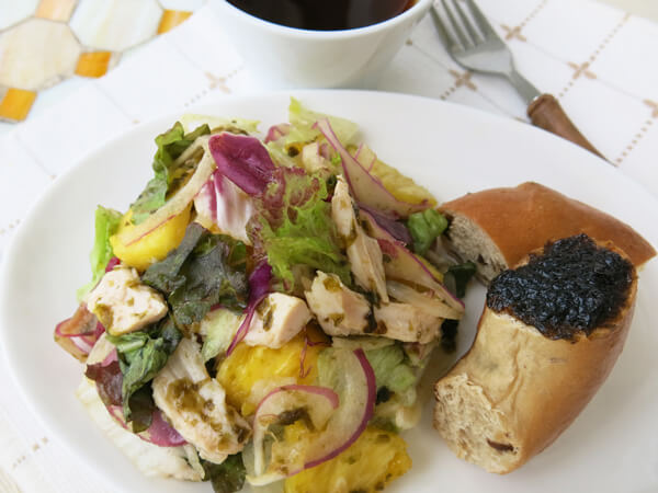 1:サラダチキンは手でさき、パイナップルは一口大に切る。
