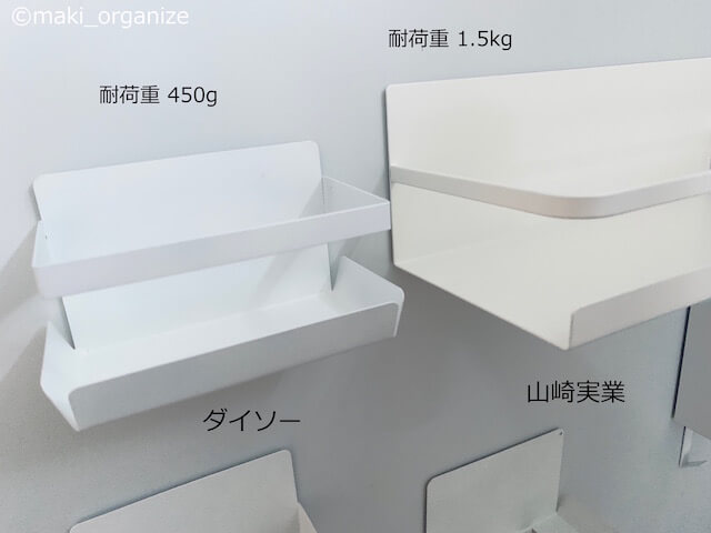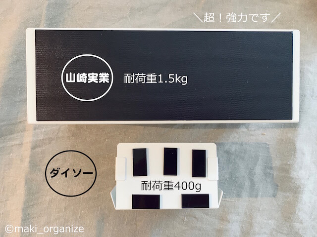 サイゾーウーマン暮らし住まいダイソーの神ブランドそっくり名品 暮らし 伊藤まきの「お片付けSOS」相談! ダイソー、あの「神ブランド」そっくりの名品は迷わず買い! “壁面収納”に革命もたらす活用実例 2020/10/05 19:30 伊藤まき(収納ライター) 「お片付け・お掃除SOS」伊藤まき 神ブランド、山崎実業のマグネットシリーズとそっくり! A・Bは山崎実業、そのほかはダイソーです(C)maki_organize 筆者宅の冷蔵庫脇にある、[A]山崎実業「マグネット コンパクトティッシュケース」と[B]山崎実業 「マグネット スパイスラック」。 ダイソーの「ONE Kitchen」シリーズを下に並べると、スッキリ感がそっくりです。 耐荷重の違いは歴然(C)maki_organize 2ブランドを比較すると、マグネットの吸着力、鉄の厚み、安定感、塗装とフォルムの美しさは山崎実業が圧勝です。でも、暮らしのワンシーンに使うならダイソーのコスパがうれしいですね。 ダイソーの弱点は「吸着力」 マグネット部分の比較(C)maki_organize 山崎実業とダイソーのマグネット部分を比較してみました。山崎実業は、裏面すべてにマグネットが付いているので、両手を使わないと剥がれないレベルの吸着力です。一方、ダイソーの吸着力は弱めなのでマグネットを追加して補強すると良さそうと感じました。 最後に、リビングや玄関を想定した実例収納を作ってみました。 次のページ マグネットを使った「壁面収納」実例 前のページ1234次のページ セブンネット 100均のベストアイディア 100均グッズのホントに良いもの全部入りっ! 関連記事 ダイソー&セリアのコレが正解! 収納のプロが指名買い「ホッピングバッグ」5つの魅力ダイソーの名品が「じゃない使い方」で大活躍! カラボの“生活臭”を3秒で目隠し……どころか“高見え”!収納のプロが「無印良品」をやめて「ダイソー」を選んだ4つの理由! 衣替えの正解は300円の「蓋付き収納 BOX」収納のプロが選ぶ、「100均水回りグッズ」! キャンドゥの4種でお風呂場スッキリ清潔収納のプロが選ぶ、セリア「100均ファイルボックス」! サイズ自由自在の“紙ボックス”活用実例3選