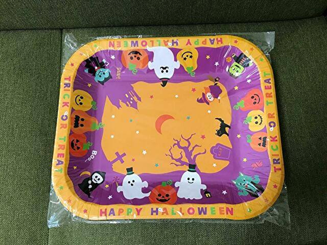 そこで「買いたい」に選んだのが、自宅でのハロウィンパーティーを盛り上げてくれそうなこの「紙皿」。大きさはA4ノートと同じくらいで、ファミリーサイズのお菓子でも余裕で収まりそうです。110円で3枚も入っていたので、コスパ的にも優秀だと思います。