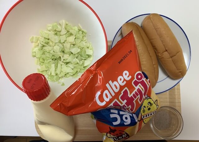 キャベツを大きめに切って、青のりと人参も用意したが、またもや写真を撮るのを忘れました。コッペパン・ポテチ(うす塩)・塩胡椒・マヨネーズで準備完了です。横須賀のパン屋さんにはいろいろな「ポテチパン」が売られてるようなのですが、人参なしだったり、キャベツなしのポテチだけをパンに挟んだりと、お店によって具材はさまざまらしい。