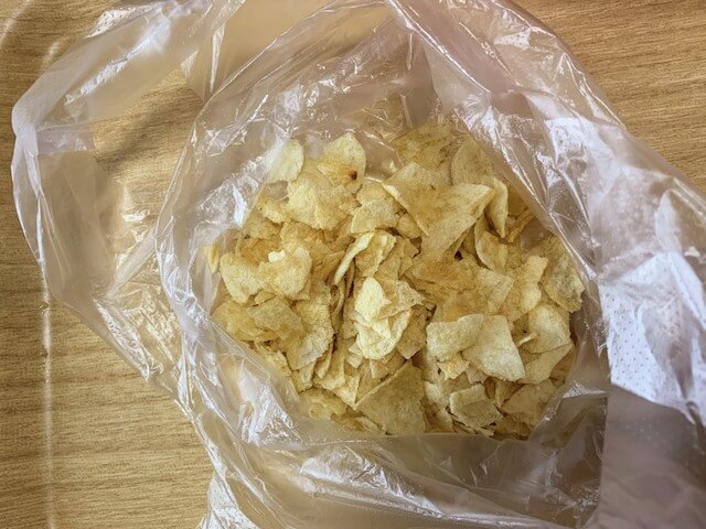 2)ポテトチップス(うすしお)を袋の上からざっくり砕く