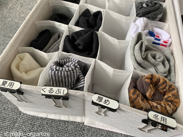 サイゾーウーマン暮らし住まいダイソーのコレ必見! 冬の悩み解決 暮らし 伊藤まきの「お片付けSOS」相談! ダイソーのコレ必見! ヒートテック・モコモコ靴下もスッキリ収納、冬のイライラ解決アイテム 2020/10/29 19:30 伊藤まき(収納ライター) 「お片付け・お掃除SOS」伊藤まき [15マス]冬のもこもこ靴下、女性の下着を収納! ダイソーの「不織布整理ケース[15マス]」(5番)は、冬のモコモコ靴下、キャミソール、下着、ネクタイなどをクルッとまるめてポイっと入れるだけ。 とくに、下着の「種類別収納」がおすすめです。例えばサニタリー、レース、フルバック、コットン、その他と5種×3枚ずつはいかが? [24マス]1年分のソックス収納! 24マスは6番(C)maki_organize ダイソーの「不織布整理ケース[24マス]」(6番)は、1年分のソックス収納に最適。 ソックスの長さ別、素材別、季節別、厚み別などに分けて管理することができます。五本指、着圧、シースルーなどニッチなアイテムも忘れません。 [24マス]なら、こんな収納が可能! マス別に分けた効果で、身支度のスピードがUP!(C)maki_organize [24マス]に、1年分の靴下を「目的別収納」してみました。 4列に分けて6個ずつを定量とします。今まで把握できなかった、靴下のレパートリーも一目瞭然です。これで、目的を持って靴下の買い足しをすることができます。 次のページ 【実例】ダイソー「不織布整理ケース」でチェストに収納 前のページ1234次のページ Yahoo 仕切り板 引き出し 仕切り 10枚セット 36*9cm 引き出し仕切り板 引き出し収納用 引き出し仕切り 引き出し仕切り 関連記事 ダイソーの入手困難「シューズケース」、収納のプロも愛用! 万能すぎる使用実例8パターンダイソーなら激安で再現可能! 収納のプロが伝授、“100均マグネット”を使った壁面収納術ダイソーの名品が「じゃない使い方」で大活躍! カラボの“生活臭”を3秒で目隠し……どころか“高見え”!収納のプロが「無印良品」をやめて「ダイソー」を選んだ4つの理由! 衣替えの正解は300円の「蓋付き収納 BOX」ダイソー・セリアの「白ボックス」一択! 100均「スクエアボックス」でカラボ収納を極める
