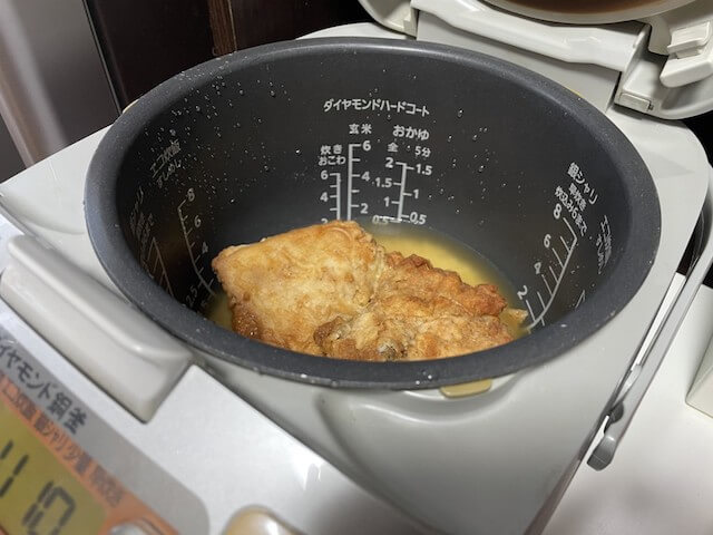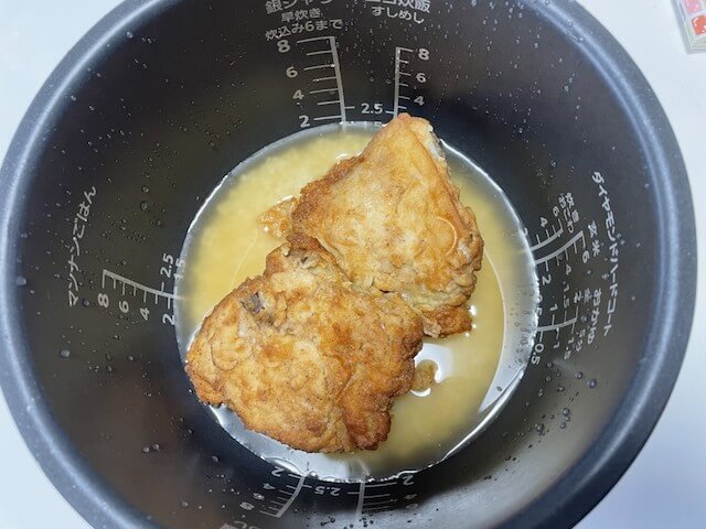 サイゾーウーマン暮らし食べ物『家事ヤロウ!!!』【ケンタッキーフライドチキン炊き込みご飯】、このうまさ誰が考えたの!? 「ケンタの正しい食べ方」の概念が変わるぞ! 暮らし 『家事ヤロウ!!!』【ケンタッキーフライドチキン炊き込みご飯】、このうまさ誰が考えたの!? 「ケンタの正しい食べ方」の概念が変わるぞ! 2020/12/16 18:00 サイゾーウーマン編集部(@cyzowoman) ツイッターレシピ、やってみました フライドチキンを炊飯器に入れるなんて…… 今回は、お米を1.5合にして、チキンも2本に減らしました。水、ケンタッキーフライドチキン・塩胡椒・醤油で準備完了です。 材料(C)サイゾーウーマン 洗ったお米に水を入れ、醤油大1と塩胡椒を少々入れましたが、フライドチキンがすでに香辛料で少し辛いはずなので、5歳の子どもも食べることを考えて本当に胡椒少々だけにしました。 レシピには「ケンタッキーフライドチキンのオリジナルチキンを3ピースのせて炊く」と書かれていたが、思いの外、フライドチキンが大きすぎたので2ピースにしました。 すごい絵面になった(C)サイゾーウーマン さて、炊き込みます。フライドチキンを炊飯器に入れるなんて……。未知の世界に飛び込んでみることにしました。 これで蓋をして炊きます(C)サイゾーウーマン ご飯を炊き込んでいるときは、「お店! ケンタッキーのお店の匂いそのままやん」というくらい、おいしすぎる匂いがたまらない。炊き上がって蓋を開けると、さらに強烈なケンタッキーの匂いに興奮した。 炊きあがった!(C)サイゾーウーマン 次のページ 5歳の小さな子どもも「めっちゃうまい」と食べ続ける 前のページ1234次のページ 楽天 ケンタッキー流部下の動かし方 関連記事 『家事ヤロウ!!!』の【フォンダンショコラ】作ったら、高級百貨店で売れるやつ……と確信した!『家事ヤロウ!!!』“エモ断”レシピ【半熟卵のベーコン巻き】作ってみたら……切ったらヤバい! 見た目も味もエモかった『ソレダメ!』レシピ【鮭の磯辺揚げ】作ったら、魚の苦手な5歳児が「サクッと食べた」!! 子ども高評価の最強メニューてぬキッチンさん【さつまいもの塩バターはちみつ】は、失敗知らずの大学芋だ! さっぱりホクホクで子どもに◎『沸騰ワード10』タサン志麻さんレシピ【えのきガレット】、この香ばしさは炙ったスルメか!? 「完全に酒のアテ」だった!