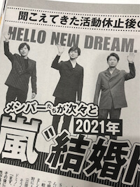 大野の覚悟と緊張が伝わってくる。さらに驚くのが、今後の嵐の結婚事情について、21年は“結婚ドミノ”が起こると報じていることだ。