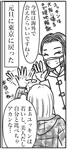 サイゾーウーマンカルチャーマンガ若くて美人な友達と比べちゃいけない カルチャー まんが『オバサンと言われても結婚したい!』39話 【アラフォー婚活ルポ】若くて美人な友達と比べちゃいけない。婚活も体力も…… 2021/04/28 13:30 白戸ミフル(マンガ家) オバサンと言われても結婚したい! 若いし、美人だし比べちゃいけない ――次回は5月2日公開! 前のページ123 白戸ミフル(マンガ家) 神奈川県出身。漫画家・ライター。タレント活動の後、マスコミ系の職業を渡り歩き、現在は化粧品メーカーに勤務。合コン歴20年以上、累計回数2500回以上。女性向けwebメディアほか、男性向けメディア、旅系メディア等でライターとして幅広く執筆。著書『合コン・アンド・ザ・シティ 恋活・婚活女子の合コンマニュアル』(ごきげんビジネス出版)、 『乳がんステージ4だった私が、それでも合コンに行きまくって救われた話』(キノブックス) 記事一覧 X:@takara0722 Instagram:@tamifull0722 【アラフォー闘病&婚活記】 最終更新:2021/04/28 13:44 関連記事 【アラフォー婚活ルポ】オンライン婚活パーティーに2回参加してみた結果……期待は禁物!?【アラフォー婚活ルポ】婚活女子を狙う“不倫男”!? 彼のヤバい事実に手がプルプル……【アラフォー婚活ルポ】やばいやばい、付き合い始めた彼は「既婚者」!? バツイチって言ったよね?【アラフォー婚活ルポ】「実は付き合うことになりました」婚活女子の報告は事件の前触れ!?【アラフォー婚活まんが】42歳、“熟女好き”27歳と過ごす夜……え、全身ツルツル!? その他の作品を読む 次の記事 NEWS・増田、リハ合間の仰天行動 >