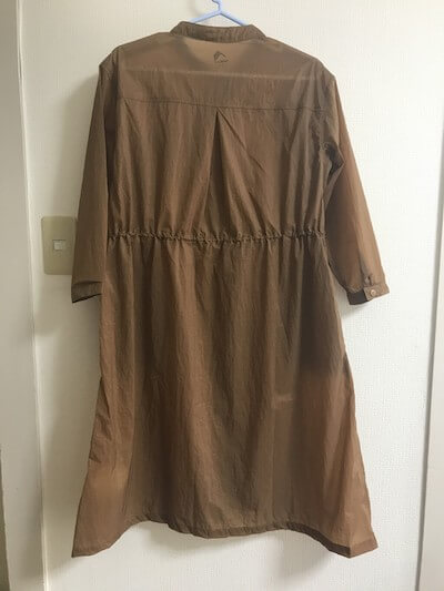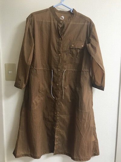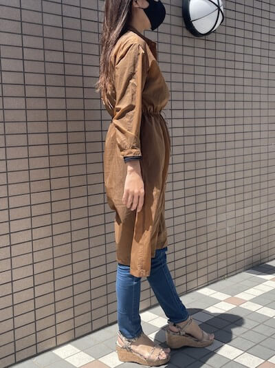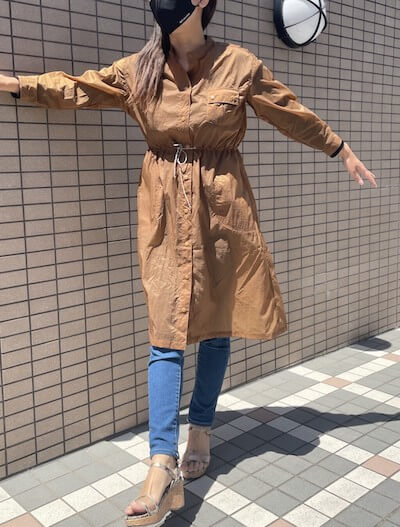 着用してみると、びっくりするくらい軽い! ラフに羽織るのもいいのだが、ボタンを閉めてウエストを絞ることでワンピ風に着こなすこともできる。今日はワンピ風にしてみた。