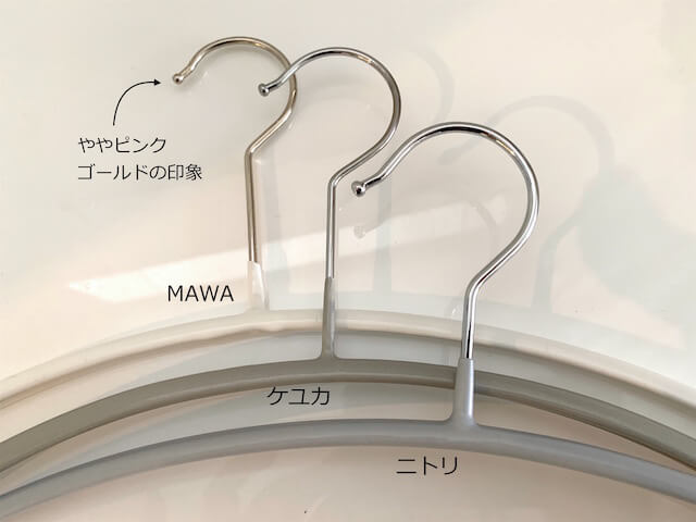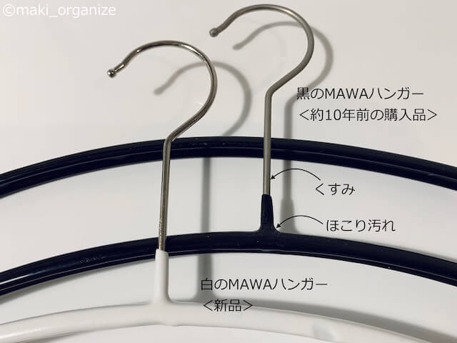 サイゾーウーマン暮らし住まい「マワハンガー」そっくりケユカのコレ優秀! 暮らし 伊藤まきの「お片付けSOS」相談! 収納のプロは「MAWA(マワ)ハンガー」よりケユカのコレ! 本家そっくりなのに100円台で超優秀! 2021/11/05 14:15 伊藤まき(収納ライター) 「お片付け・お掃除SOS」伊藤まき [ポイント4]スリムなのにガタガタしない頑丈なつくり MAWAのように、刻印があればもっと良かった!(C)maki_organize 筆者私物の「MAWA」は、ガタガタしない頑丈なつくりでした。同じく「ケユカ」もスリムなのにしっかりした印象。 一方で「ニトリ」は、フックの接続部分を強く回すとガタガタする品も有り。ともに3本セットなので偶然かもしれませんが、品質の安定もメーカー選びのポイントですね。 [ポイント5]クローゼットが楽しくなる、エレガントカラー MAWAには白とシルバー、グレーもあります(C)maki_organize 「ケユカ」と「ニトリ」のカラーの違いもチェック。印象としては、「ケユカ」は上品な大人のブラウングレー。「ニトリ」は、案内通りのシルバーです。また、ステンレスフックの色も3種とも異なりますね。高見えデザインも「ケユカ」の魅力です。 一方で、これら3つのMAWAハンガーとそっくりハンガーにはデメリットもあります。それは、MAWA、ケユカ、ニトリの全てに共通する材質「塩化ビニル」。以下がそれぞれの材質になります。 ■【MAWA】スチール(ニッケルメッキ)、特殊塩化ビニル樹脂(ドイツ製) ■【ケユカ】スチールメッキ、塩化ビニル樹脂(中国製) ■【ニトリ】スチール、ポリ塩化ビニル(中国製) [3つ共通デメリット]塩化ビニル製の経年劣化について (C)maki_organize 筆者が10年ぐらい使っている黒のMAWAハンガーです。高温多湿の部屋で使ったせいか、塩化ビニルがベタベタして埃の付着が目立ちます。白のMAWAと比べると、フックの色も褪せてしまいました。汚れが気になった時に、水拭きのメンテナンスを怠ってしまった結果です。品質の良いモノは頑丈で長持ちもしますが、経年劣化はやはりあります。 冬のかさばるアウターを、「MAWA風ハンガー」でスッキリした後は……。もっとコンパクトに収納する方法を、[おまけ]で紹介! 次のページ [おまけ]ダイソーの「吊れる圧縮袋」で、かさばる冬物もスリム化! 前のページ12345次のページ Yahoo MAWA ドイツのすべらないマワハンガー レディースサイズ エコノミック 40P 10本組 ライトグレー 関連記事 洗濯物は「畳まない」でOK! ダイソー・ニトリ・スリコほか「進化系ハンガー」6種を比較レビュー!収納のプロが大人気「ハンギングワイヤーバスケット」をキャンドゥ・スリコ・IKEAで比較! 9通りの使用実例セリア大人気「ワイヤーバスケット」、収納のプロがダイソー・スリコ・IKEAと比較&使い分け人気ベストセラー「イオンの保存容器」、収納のプロが徹底ジャッジ! セリア・カインズと比べてわかった、真の最強アイテムは!?ダイソー品切れ大ヒット「ワンプッシュ保存容器」、収納のプロがカインズ・ニトリと徹底比較ジャッジ!