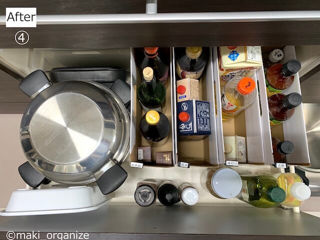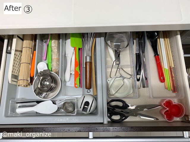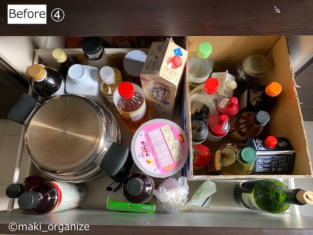 サイゾーウーマン暮らし住まいキッチン収納ビフォーアフター 暮らし [連載]30代女子の「煩悩部屋」ビフォーアフタ キッチン「コンロ下&シンク下」収納、ビフォーアフター8連発! 100均アイテムだけでプロがスッキリ手直し 2021/11/22 19:30 伊藤まき(収納ライター) 「汚部屋」ビフォーアフター [3_Before]作業台の下、1段目 サプリ、ふきんは専用コーナーへ(C)maki_organize コンロ脇の作業台の下、1段目の引き出しです。カトラリー用の仕切りケースが付いていたため、お箸などが入っていましたが、それらは食器と一緒に用意するので、動線とは合いません。 ほか、調理ツールやサプリなどキッチン小物が山のように「重ね置き」です。どれも、上のモノをどかして取る面倒がかかります。 [3_After]コンロ脇の引き出しは「調理ツール」がベスト! 使わないツールは、処分済みです(C)maki_organize カトラリー類は、食器棚の引き出しへ移動して「調理ツール」専用に変更しました。キッチンハサミや長箸など、2本以上あるツールは「使いやすい方のみ」残します。詰め込まないゆとり収納で、目的の道具を「1発で出す」ことができます。ほか、大型のツール(おたま、木べら、トング)などは、コンロ脇のツールスタンドへ。 [3のポイント]キッチン道具の予備は、忘れない箱へ保管! 道具の予備、在庫は別の箱へまとめて保管(C)maki_organize 同じ空間に予備ツールを置くと、よく使うモノの邪魔になります。すぐ使わない道具は、次に使うまでまとめて保管します。透明の見える袋と箱にまとめると、持っていることを忘れずに済みます。 [4_Before]作業台の下、2段目(中段) 液漏れしても、ダンボールなら安心(C)maki_organize コンロ脇の作業台の下、2段目の引き出し(深型)です。調味料は、コンロの左側の引き出しが便利です。でも、Beforeの写真を見る限り「1発で取り出す」のは難しそう。ルールなしに置くと「使い忘れ」も増えがちです。 [4_After]調味料は、10cm幅ボックス「グループ列」に! 紙製ボックスを半分に切っても可(C)maki_organize 調味料も、醤油系、オイル系、お酢類、味付けなどグループ別に分けます。調味料ボトルファイルボックス(約W10cm)に、列でまとめいれます。手前からよく使うモノ順に列べます。 [4のポイント]調味料は「キャップに直書き」で見える化 道具と食材はすぐ出せるように(C)maki_organize キャップの上に、調味料の種類を直書きしています。ちょっとした手間ですが、取り間違えのストレスがなくなります。キッチンで使う洗剤類も同じです。ほか、カラフルな円形ラベルを用意してキャップ上に貼るのも◎ 漂白剤ボトルのピンクのように「色」で判断できると、素早く取り出せます。 次のページ [5_Before]作業台の下、3段目(最下段) 前のページ1234次のページ Yahoo フライパンラック ポットラック 鍋ラック 鍋蓋スタンド フライパンスタンド ふたスタンド シンク下収納ラック キッチン収納 多機能 パンラック まな板 関連記事 ダイソーのコレが救世主! 使いにくい「トースターラック」が収納力アップ、機能的にスッキリ激変シンク・コンロまわりの「片付けしんどい」問題を解決! 散らかったゴチャゴチャがスッキリ、ビフォーアフター実例ダイソーとイケアのラックで解決! 800円で狭小キッチンボードに“収納ラック”を作るプロのワザ食器棚の「○○ケース」をなくして、収納力アップ! 家事効率がグングン上がるビフォー・アフター実例集食器棚で「やってはいけないNG収納」5連発! 使いにくくて、散らかりやすい……プロが片付けした結果、こうなった