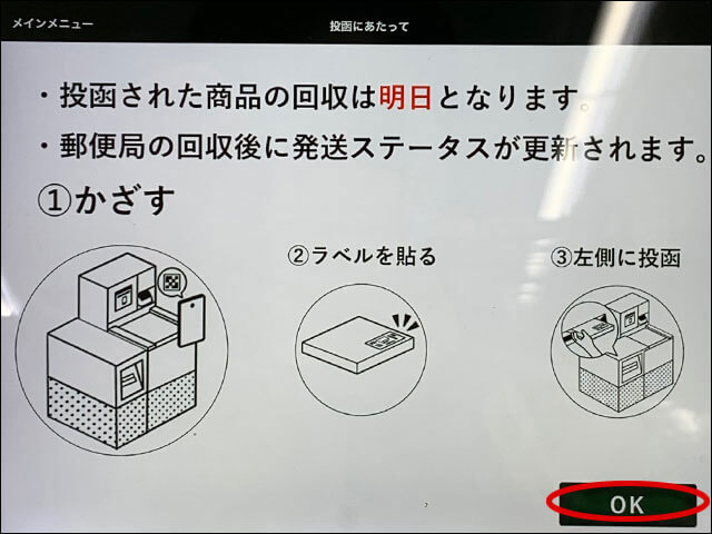 サイゾーウーマン暮らしトレンドメルカリで「スマリボックス」を使ってみた 暮らし [体験レポート] ローソン「スマリボックス」でメルカリ発送やってみた! 使い方・対応サイズ、注意点まとめ 2022/01/28 22:00 サイゾーウーマン編集部 トレンド暮らし 「スマリボックス」使い方は6ステップ! ローソン店頭のスマリボックス(C)サイゾーウーマン 左側のスタートボタンをプッシュ(C)サイゾーウーマン 2次元コードを画面に近づけすぎないのがポイント(C)サイゾーウーマン スマリの使い方は6工程。実際に順を追って詳しくレポートしていきます! スマリの操作手順1:2次元コードを画面にかざす (1)まずは、ローソン店頭にあるスマリボックスの画面左側「e発送サービス」の「START」ボタンを押し、メルカリアプリ上で作成した2次元コードを、黄色の枠内に収まるようにかざします。2次元コードは画面に近づけすぎないよう、やや離してかざすと、スムーズに読み取られました。 受付番号とパスワードでの手続きも可能です(C)サイゾーウーマン 機械が2次元コードを読み取らない場合は、「受付番号」と「パスワード」でも手続きが可能。右下にある「番号検索」のボタンを押し、メルカリで作成した2次元コードの下に表示されている12桁の受付番号と4桁のパスワードを入力します。 申込内容が表示されます(C)サイゾーウーマン スマリの操作手順2:申込内容を確認して「OK」 (2)画面に書かれている申込内容を確認し、問題がなければ「次へ」ボタンを押します。 荷物の回収日を確認してください(C)サイゾーウーマン スマリの操作手順3:投函方法を確認して「次へ」 (3)「投函にあたって」の詳細を確認し、「OK」ボタンを押します。 なお、郵便局の集荷時間の関係上、手続きを行うタイミングによっては、荷物が翌日の回収となってしまうケースも。店舗ごとに集荷時間が異なるため、あらかじめローソン店内に設置された郵便ポストで、集荷時間を確認しておくといいかもしれません。急ぎの場合は、お近くの郵便局の窓口で発送したほうがいいでしょう。 次の手順を説明してくれます(C)サイゾーウーマン 次のページ スマリの操作手順4:「ご利用上の注意」に同意して送り状を「発行する」 前のページ1234次のページ 楽天 メルカリ発送らくらくセット 決定版 関連記事 メルカリ初心者必見! 「らくらくメルカリ便」と「ゆうゆうメルカリ便」の違いを買い物狂いが解説メルカリの「売上金」は “現金化”すべし! 200円の振り込み手数料をケチってはいけないワケメルカリで50万のリングを泣く泣く出品! 高額商品が秒で売れた“カラクリ”とは?メルカリで危うく「低評価」ユーザーに!? “地雷購入者”にぶち当たらないための見分け方を、買い物狂いが解説!メルカリの「発送方法」を見落として大失敗!? 商品の「梱包」で損をしないためのコツ