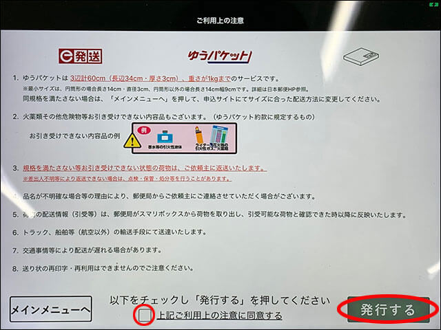 サイゾーウーマン暮らしトレンドメルカリで「スマリボックス」を使ってみた 暮らし [体験レポート] ローソン「スマリボックス」でメルカリ発送やってみた! 使い方・対応サイズ、注意点まとめ 2022/01/28 22:00 サイゾーウーマン編集部 トレンド暮らし スマリの操作手順4:「ご利用上の注意」に同意して送り状を「発行する」 (4)注意事項を確認し、画面下部の「上記ご利用上の注意に同意する」にチェックを入れ、「発行する」を押します。 8つの注意事項を確認のうえ、チェックボックスにマークを忘れずに(C)サイゾーウーマン スマリの操作手順5:送り状を荷物に貼り、荷物を投函 (5)画面右側にある黒い印刷機から「送り状」シールと「お客様控え」の2枚が出てくるため、送り状を荷物に貼り、荷物を投函口へ入れます。「次へ」ボタンを押すと、スマリボックスでの発送手続きが終了。なお、「お客様控え」は取引終了まで大事に保管。 送り状とお客様控えが右側の印刷機から出てきます(C)サイゾーウーマン 送り状を荷物に貼り、投函!(C)サイゾーウーマン スマリの操作手順6:メルカリで発送通知 (6)メルカリ上アプリの取引画面を開き、発送通知を行います。 メルカリ上で「発送通知」を行ってください スマリボックス、配送物の重さに注意! ちなみに、スマリボックスを利用した場合、メルカリに追跡データが連携されるまで時間がかかり、なかなか「購入者の受取をお待ちください」という発送画面から「商品の発送を通知しました」という配達画面に切り替わらず、きちんと郵便局に引き受けられたのか不安になりました。 日本郵便の郵便追跡サービスでは、メルカリの「受付番号」もしくはお客様控えに記載されている「お問い合わせ番号」から荷物の配送状況を調べることができるので、気になった場合は調べてみるといいかもしれません。 なお、郵便局での引き受け処理中にサイズ違いや重量オーバーが発覚し、返送されてくる場合も。スマリボックスに備え付けられている「測定スケール」では、荷物の厚みをチェックすることができますが、3辺の長さや重さは測ることができないため、事前に自宅で測定しておくことがおすすめです。 次のページ スマリボックスのメリットとデメリット 前のページ1234次のページ 楽天 メルカリ発送らくらくセット 決定版 関連記事 メルカリ初心者必見! 「らくらくメルカリ便」と「ゆうゆうメルカリ便」の違いを買い物狂いが解説メルカリの「売上金」は “現金化”すべし! 200円の振り込み手数料をケチってはいけないワケメルカリで50万のリングを泣く泣く出品! 高額商品が秒で売れた“カラクリ”とは?メルカリで危うく「低評価」ユーザーに!? “地雷購入者”にぶち当たらないための見分け方を、買い物狂いが解説!メルカリの「発送方法」を見落として大失敗!? 商品の「梱包」で損をしないためのコツ