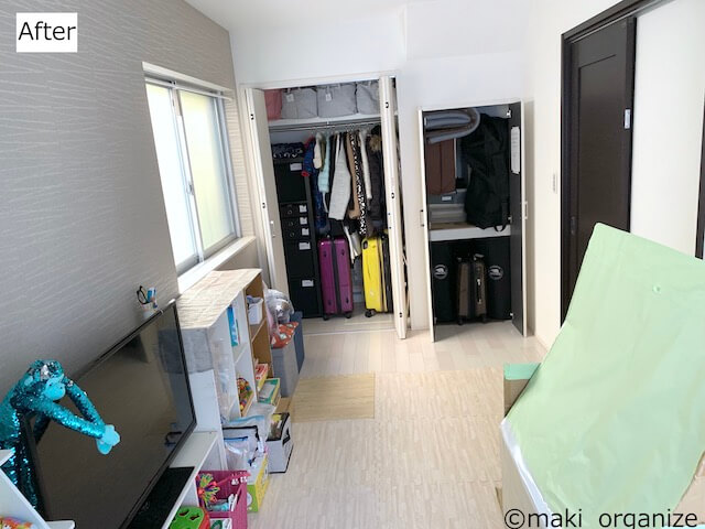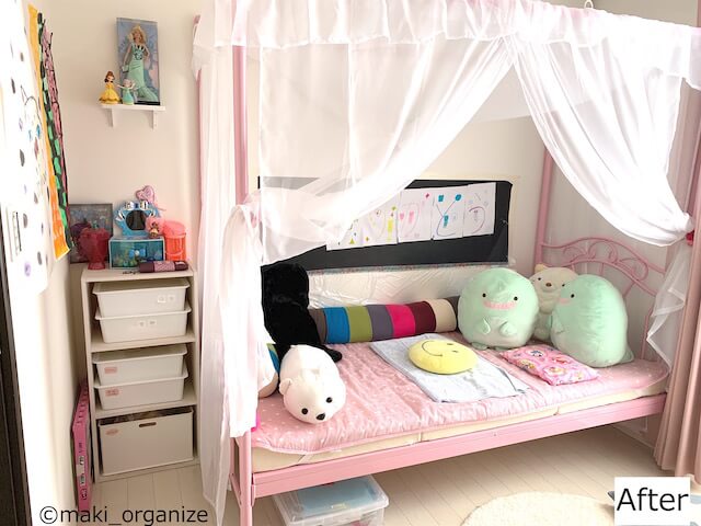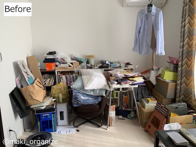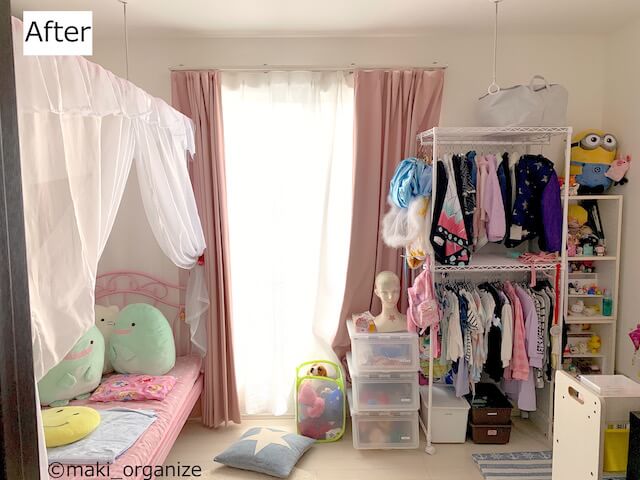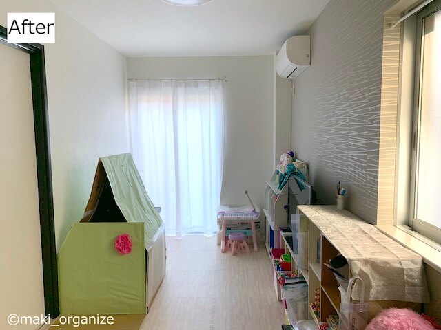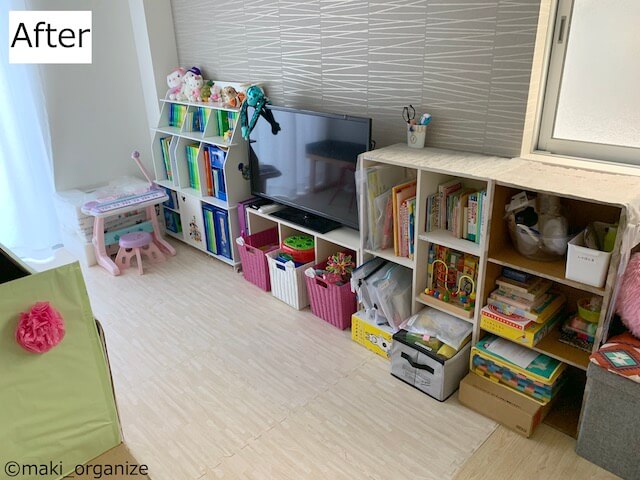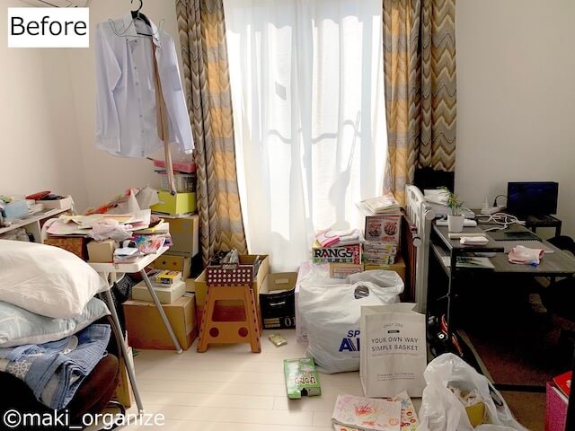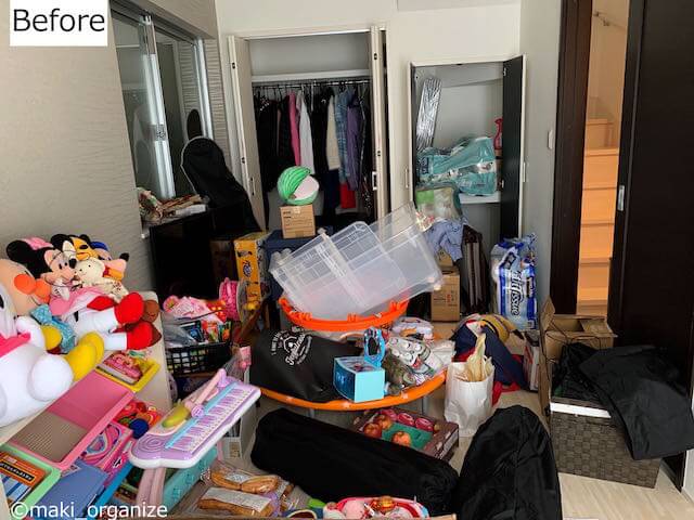 サイゾーウーマン暮らし住まい汚部屋の衝撃ビフォーアフター25連発! 大量の荷物の山、モノで埋もれた部屋が劇的スッキリ 暮らし [連載]30代女子の「煩悩部屋」ビフォーアフター 汚部屋の衝撃ビフォーアフター25連発! 大量の荷物の山、モノで埋もれた部屋が劇的スッキリ 2022/01/10 19:49 伊藤まき(収納ライター) 「汚部屋」ビフォーアフター 子どものプレイルームの片付け 子どもたちが安全に遊べる「プレイルーム」のはずが、買い物のストックや屋外グッズを 「ちょい置きする部屋」になってしまいました。将来的には、第二子の子ども部屋なので、 「レイアウト変更しやすい部屋」へと変えていきます。 [Before.7]1階 左部屋(物置き) 収納する棚がないので、ぜんぶ床置き!(C)maki_organize [After.7]1階 左部屋(プレイルーム) カラーボックス4個を列べて、おもちゃラックに!(C)maki_organize 改めて家具を用意すると、モノが増えるだけなので「持っている家具」を見直します。4つカラ ボに入っていた大人の本、DVDはブックオフ(約3,000円の利益)へ。収納不足に困ったら、 買うより先に「大人の私物」を減らします。いつか使うかもより、今(子ども)使うモノを優 先にすると楽になります。 【ポイント】 家にあった4つのカラボを、見直して再利用! [Before.8]1階 左部屋(物置き) オシャレなテレビ台が、モノで埋もれています(C)maki_organize [After.8]1階 左部屋(プレイルーム) カラボを横置きして、テレビ台に!(C)maki_organize 「持っている家具」を使いまわして、「売る家具」で予算を作ります。オシャレなテレビ台が ありましたが、収納力ゼロなのでジモティーへ。カラーボックスを横置きして、収納できるテレビ台に変わりました。「売る家具」で得た予算は、3,000円です。 [ポイント]収納力ゼロの家具を売って、3,000円の利益! [After.9]1階 左部屋(テレビまわり) レイアウト変更時は、カラボを処分するだけでOK(C)maki_organize カラボにまとめたおもちゃコーナーです。ここで用意したのは、100均のB4ビニールケース など5点ほど。ほか、あちこちの部屋にあった収納ボックスを使ったので合計500円で済みまし た。 もっと細かく知りたい方は、【29回】「おもちゃのプレイルーム」へ 100均とカラボだけで大変身! 整理収納のプロが、「物置き部屋」をプレイルームにスッキリ片付け連載企画「30代女子の「煩悩部屋」ビフォー・アフター」の新シーズンが始まりました。今回は、汚部屋あらため「汚家(おうち)」をまるごと片付けます! クライアントは板橋区・3S...サイゾーウーマン2021.11.29 [Before.10]3階 仕事部屋&物置き 日当たりの良い部屋が、物置きに……(C)maki_organize [After.10]3F 子ども部屋へ変更 ラック上に埃よけとして100均のプラダンを置く(C)maki_organize 3階の仕事部屋を、子ども部屋に。扉付きのクローゼットは、小さな子どもには難しいため「見 える収納」に揃えます。アイリスオーヤマの「ワードローブ2段」は、新しく用意しました。子どもの身⻑に合わせて高さを変えられるので便利です。フラップ式の収納ケースは、中古店で3 個で1,000円。カラーボックスは、2段を魔法のテープで繋げて4段の高さに変えています。 [ポイント]子ども服収納は、アイリスオーヤマのラックが便利! [Before.11]3階 仕事部屋&物置き 使っていないモノの山が部屋に陰を作ります(C)maki_organize [After.11]3階 子ども部屋へ変更 (C)maki_organize 子ども部屋を記念して、可愛らしい「お姫様ベッド」をプレゼントしたKさん(予算対象外)。 サイドのカラーボックスには、小物や文具のストックを。「持っている家具」と「持っている収納ボックス」で片付きました。壁上のお人形コーナーは、100均「クィックラック」です。大きな予算をかけずに、夢のような子ども部屋に変身です! カラフルな収納ボックスが、子ども服のサイズにぴったり(C)maki_organize 1階にあったおもちゃラックは、「子ども服収納」に変わりました。手持ちの洋服を上から見渡 せるので、自分で着替えるのも簡単。ほか、小さなフィギュアたちも100均で「見える収納」 に。お子さんが自分で残すと決めた宝物なので、しまいこまずに飾ります。 [ポイント]子どもの小物収納はぜんぶ100均! もっと細かく知りたい方は、【12回】「おもちゃラックで子ども服」へ 物置部屋が、可愛らしい子ども部屋に激変!! 収納のプロが実演、使わなくなった「おもちゃラック」はアレに使うと正解連載企画「30代女子の「煩悩部屋」ビフォー・アフター」の新シーズンが始まりました。今回は、汚部屋あらため「汚家(おうち)」をまるごと片付けます! クライアントは板橋区・3S...サイゾーウーマン2021.07.19 もっと細かく知りたい方は、【13回】「ディスプレイ収納」へ ダイソーのアレを切るだけ、200円で完成! フィギュアや小さなおもちゃの「大量ディスプレイ収納」でスッキリ解決連載企画「30代女子の「煩悩部屋」ビフォー・アフター」の新シーズンが始まりました。今回は、汚部屋あらため「汚家(おうち)」をまるごと片付けます! クライアン