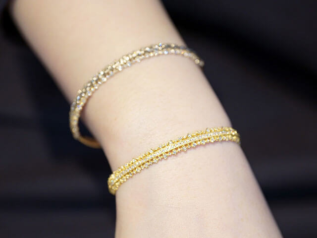 68万2,000円のシャンパンゴールドのほう(写真上)も、中央の彫り線デザインが地味かなあと思ったけど、そんなこともなくて、キラッキラで美しい。90万2,000円するイエローゴールドのほうは、ダイヤが敷き詰められてるんだけど、これはあっぱれな美しさ!!