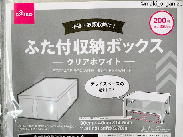 サイゾーウーマン暮らし住まいダイソーとセリア「クリアボックス」プロが紹介 暮らし 伊藤まきの「お片付けSOS」相談! ダイソーとセリアから登場! 収納のプロたちが歓喜「フタ付クリアボックス」詳細紹介【サイズ・色・使用実例】 2022/03/28 19:50 伊藤まき(収納ライター) 「お片付け・お掃除SOS」伊藤まき ダイソー「クリアボックス」各種サイズ ダイソー[1]ふた付収納ボックス 110円 ダイソー「ふた付収納ボックス」(C)maki_organize ■サイズ:W19×D26×H26cm(色:クリアホワイト、グレーの2色) カラーボックスの空間、タテ1/2にぴったりのサイズです。似たカタチだと、無印良品の「やわらかポリエチレンケース・ハーフ(590円税込)」ニトリ「Nインボックス(W) たて型ハーフ(599円税込)」が有名です。 ダイソー[2]ふた付収納ボックス 220円 ■サイズ:W37×D26×H26cm(色:クリアホワイト、グレーの2色) 先に紹介したセリアの「フタ付クリア収納ボックス(深型)」とほぼ同じサイズですが、価格は2倍です。大きな違いは、取手が2面に付いている点です。ビニールの生地も、セリアより強く厚みがあるように感じます。 ダイソー[3]ふた付収納ボックス 220円 ダイソー「ふた付収納ボックス」(C)maki_organize ■サイズ:W30×D40×H14.5cm(色:クリアホワイト、グレーの2色) 商品の説明イラストでは、テレビ台やローテーブルの下などのデッドスペースの活用を促していますが、クローゼット上段(奥行き40cm)やカラーボックス(内寸横幅40cm)にも使えます。 続いて、ダイソーの「クリアボックス」3種類のサイズ感を見ていきましょう。セリアと同じく、カラーボックスとクローゼット上段に置いたてみました。 次のページ ダイソー「クリアボックス」、実際のサイズ感は? 前のページ12345次のページ 楽天 収納力グンとアップ! 100円グッズ活用術 関連記事 収納のプロが大人気「ハンギングワイヤーバスケット」をキャンドゥ・スリコ・IKEAで比較! 9通りの使用実例無印良品と比べて納得! 収納のプロが、3COINS(スリーコインズ)「クリアボックス」を指名買いのワケダイソー・セリアの「白ボックス」一択! 100均「スクエアボックス」でカラボ収納を極める収納のプロが選ぶ、セリア「100均ファイルボックス」! キッチン・クローゼットの使い方実例100均「透明ボックス」収納で“賞味期限切れ”一掃! 食品ストック癖は年8万円のムダだった