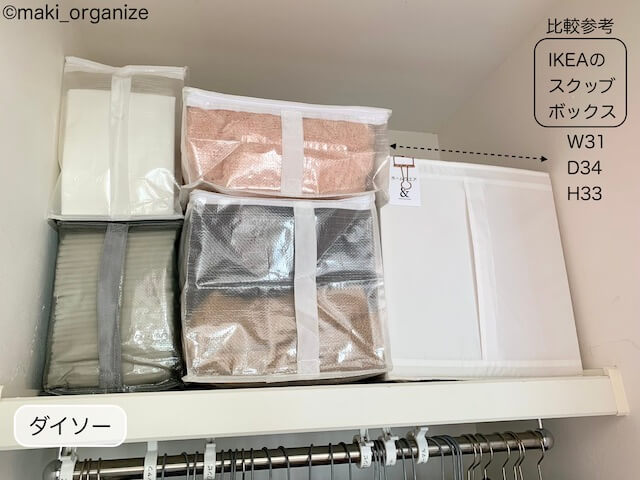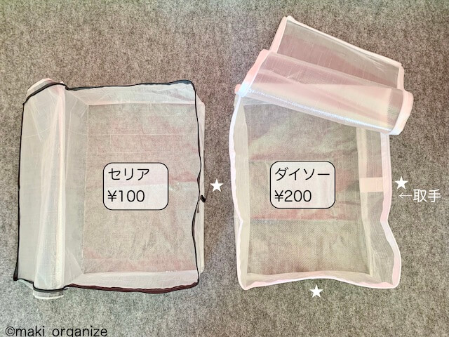 サイゾーウーマン暮らし住まいダイソーとセリア「クリアボックス」プロが紹介 暮らし 伊藤まきの「お片付けSOS」相談! ダイソーとセリアから登場! 収納のプロたちが歓喜「フタ付クリアボックス」詳細紹介【サイズ・色・使用実例】 2022/03/28 19:50 伊藤まき(収納ライター) 「お片付け・お掃除SOS」伊藤まき ダイソー「クリアボックス」、実際のサイズ感は? 2色展開のグレーも用意しました。(C)maki_organize ダイソーの「クリアボックス」3種類を、ニトリのカラーボックスにイン。ビニールの生地が厚めなので、四隅がしっかりして安定感があります。大きなポイントは、取っ手の紐が長い点です。高所に置いても、出し入れしやすいデザインですが、どこかで見た記憶がありませんか? クローゼット上段に最適! 長い取手は、取り出しやすさナンバーワン!(C)maki_organize ダイソー「ふた付収納ボックス」3種類を、クローゼット上段(奥行き40cm)にイン。右端に、IKEA「SKUBBボックス(1,799円、3P入り)を用意しました。こうして並べると、取っ手のデザインが同じですよね! 紐が長いと使用者の身長に最適の位置で、簡単に出し入れができます。 各メーカーの良い点をしっかり研究した、ダイソーのこだわりを感じます。次に、セリアとダイソーの違いを比較してみましょう。 [比較] ダイソー1/2サイズのみジッパーの開け方が違います(C)maki_organize 価格面ではセリアの2倍のダイソーですが、生地の厚みと取っ手のデザインが豪華に感じます。また、素材も違います。ダイソーは、ポリプロピレン(PP)製で食品の保存容器などの材料。無印良品の衣装ケースも、PP素材なので聞き覚えがあると思います。一方のセリアは、ポリエチレン(PE)製でポリ袋などに使われるようです。 衣替えの洋服、バッグの保管、小物の保管などならセリアで間に合う一方、以下の3つに当てはまる場合は、ダイソーがおすすめです。 (1)手を伸ばす高所へ置きたい (2)漫画やストック品など、少し重めのモノを保管したい (3)生地のシワ付きを抑えたい 素材がしっかりしている分、お値段アップとなったのかなと筆者は感じました。 次に、「何を入れたら良いの?」という問いに答えます。 次のページ セリア・ダイソー「クリアバッグ」使い方! 前のページ12345次のページ 楽天 収納力グンとアップ! 100円グッズ活用術 関連記事 収納のプロが大人気「ハンギングワイヤーバスケット」をキャンドゥ・スリコ・IKEAで比較! 9通りの使用実例無印良品と比べて納得! 収納のプロが、3COINS(スリーコインズ)「クリアボックス」を指名買いのワケダイソー・セリアの「白ボックス」一択! 100均「スクエアボックス」でカラボ収納を極める収納のプロが選ぶ、セリア「100均ファイルボックス」! キッチン・クローゼットの使い方実例100均「透明ボックス」収納で“賞味期限切れ”一掃! 食品ストック癖は年8万円のムダだった