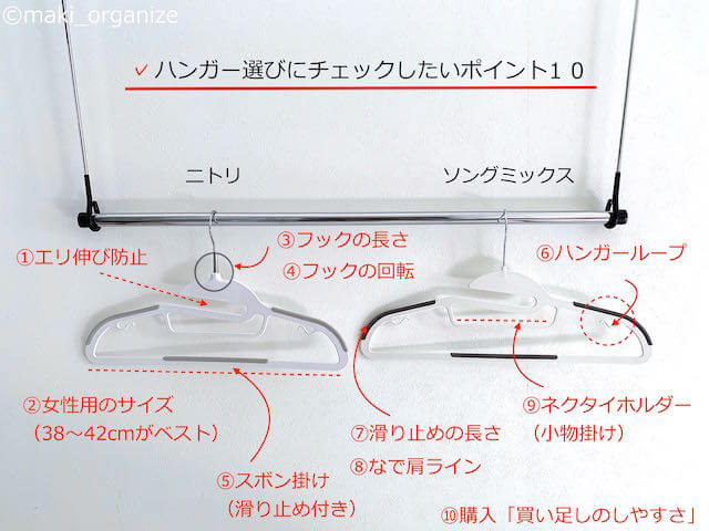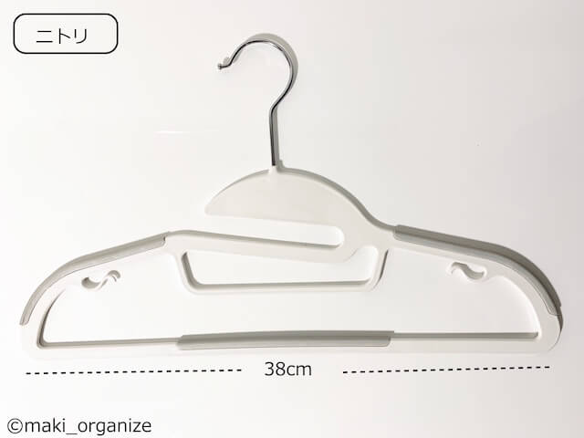 サイゾーウーマン暮らし住まいダイソー・ニトリ他「進化系ハンガー」比較 暮らし 伊藤まきの「お片付けSOS」相談! 「ニトリ」のハンガーなら洗濯物は「畳まない」でOK! 収納のプロがダイソー・スリコ他6種と比較レビュー! 2022/04/26 20:30 伊藤まき(収納ライター) 「お片付け・お掃除SOS」伊藤まき どれを選ぶ? 微妙に違う「進化系ハンガー」の選び方! プラスチック製のハンガーの場合(C)maki_organize 今回検証したのは、[1]ダイソー[2]スリーコインズ[3]ニトリ[4]SONGMICS (ソングミックス) の商品です。すべて、滑り止めが付いています。さらに、ファストファッションに多いハンガーループ(細い紐)付きで、スカーフなど服装小物を掛けられるようにデザインされています。 この中から筆者が選ぶのは、ニトリとソングミックスです。 安心の「ニトリ」と、 amazonの「ソングミックス」がおすすめ! フックが360度回転すれば、掛ける場所も自由(C)maki_organize 筆者が片付けに用意するのは、ニトリ「すべりにくい省スペースハンガー レディースサイズ」or ソングミックス「型崩れしない Tシャツハンガー」です。ハンガーを選ぶ際にチェックしている10のポイントもクリアしています。 さらに、1本ずつ詳しくチェックしてみましょう! ニトリ「すべりにくい省スペースハンガー レディース」5本セット 5本304円/1本あたり60,8円/40本で2,432円(すべて税込)(C)maki_organize ニトリのハンガーは、5本単位で買い足しできる点が◎。比較した4種の中で、最もハンガーのフック(首)が長いので、ポールに掛けやすくなります。フックが長いほど、クローゼット内の洋服が見えやすくなるのでスッキリ効果も上がります。 次のページ ソングミックス「型崩れしない Tシャツハンガー」20本セット 前のページ1234次のページ 楽天 3人子持ちで起業した理系の主婦が名もなき家事をサクッと解決します! 関連記事 ダイソー品切れ大ヒット「ワンプッシュ保存容器」、収納のプロがカインズ・ニトリと徹底比較ジャッジ!ダイソー・無印良品と比較して決定! 収納のプロが、3COINS(スリーコインズ)「クリアボックス」を指名買いのワケ5年分のホコリが積もった「カーテン」、カビの根が生えた「窓枠サッシ」……汚部屋をプロが大掃除してみた!プロに学んだ大人気「ウタマロクリーナー」の5つの使い方! オキシクリーンも重曹もいらない大掃除テクニックを伝授ダイソーなら予算10分の1でOK!? 収納のプロが体当たりレポート、「魔法のテープ」不要でここまでできる