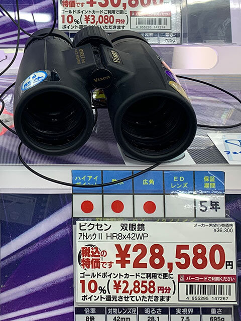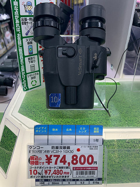 サイゾーウーマンインタビュー「安くて使いやすさ◎」会場別おすすめ防振双眼鏡 男性アイドル インタビュー後編 ジャニーズファン必見!「安くて使いやすさ◎」おすすめ防振双眼鏡を、ヨドバシカメラ販売員が解説【東京ドーム、横アリほか会場別】 2022/04/30 14:00 サイゾーウーマン編集部 ジャニーズインタビュー ヨドバシカメラ マルチメディアAkiba店の双眼鏡売り場(C)サイゾーウーマン 今やコンサートや観劇の「必需品」となりつつある双眼鏡。“推し”の姿をより近くではっきりと見ようと、夏のコンサートツアーに向けて、購入を検討している人も多いのではないだろうか。 今回、サイゾーウーマンでは、ヨドバシカメラ マルチメディアAkiba店カメラ専門チームマーケット・イノベーターの川上朋孝さんに取材を敢行。インタビュー前編に引き続き、後編ではホールクラス、アリーナクラス、ドームクラスの3つの会場別におすすめの双眼鏡について話を聞いた。双眼鏡選びにぜひお役立ていただきたい。 * * * ジャニーズコンサート、ホールクラスでおすすめの双眼鏡2選 ――インタビュー前編では、コンサートや舞台観劇には8~10倍の双眼鏡が最適で、対物レンズが大きいものを選ぶことがポイントだと伺いました。では、具体的にNHKホールや帝国劇場など、ホールクラスの会場におすすめの商品はどちらになりますか? ビクセン「アトレックII HR8×32WP」(2万4,640円)(C)サイゾーウーマン 川上朋孝さん(以下、川上) 当店で人気なのは、ビクセンの「アトレックII HR8×32WP」(2万4,640円)という商品。32mmとレンズが比較的大きく、ほかのメーカーの同じスペックの機種よりもボディが小さいことが特徴で、持ち運びがしやすくなっています。 ――コンサートになると、2時間ほど手に持つことになりますから、特に女性ファンにとっては、 “ボディの重さ”も非常に重要なポイントになりそうですね。 ニコン「STABILIZED 10×25」(7万5,900円)(C)サイゾーウーマン 川上 一方、防振タイプだと、410gと少々重くはなってしまうのですが、ニコンの「STABILIZED 10×25」(7万5,900円)。電源ボタンを押し続けると、「STABILIZED(手ブレ補正)機能」が起動します。10倍とホールクラスの会場にはやや倍率は高めですが、防振なのでやはり視界がブレないというところと、10倍クラスの中ではレンズの前側が大きいので、目が疲れにくいというのが一番の特徴。価格帯も、このレベルの商品としては、比較的リーズナブルです。 ジャニーズコンサート、アリーナクラスの会場でおすすめの双眼鏡4選 ――続いて、横浜アリーナや国立代々木競技場第一体育館など、アリーナクラスでおすすめの双眼鏡を教えてください。 ビクセン「アトレックII HR8×42WP」(2万8,580円)(C)サイゾーウーマン 川上 ホールクラスで紹介したビクセンの双眼鏡の一つ上のモデル「アトレックII HR8×42WP」(2万8,580円)がおすすめです。42mmと、対物レンズが大きくなりますので、より視界が広くなります。 ビクセン「アリーナスポーツMP8×25」(1万4,030円)と「アリーナスポーツMP10×25」(1万5,120円)(C)サイゾーウーマン また、より手ごろな価格帯のシリーズでは、インタビュー前編でも紹介した、同じくビクセンの「アリーナスポーツMP8×25」(1万4,030円)や「アリーナスポーツMP10×25」(1万5,120円)が、比較的コンパクトかつ使いやすいモデルです。 ケンコー「VC スマート 10×30」(7万4,800円)(C)サイゾーウーマン 一方の防振タイプでは、ケンコーの「VC スマート 10×30」(7万4,800円)がおすすめ。こちらは、ON・OFFの切り替え式の電源なので、ボタンを押し続ける必要がありません。また、接眼レンズ部分の枠がしっかりした作りになっているので、目が痛くなりづらいというところと、対物レンズが30mmと大きくなりますので、見やすくなっています。 次のページ ジャニーズコンサート、ドームクラスの会場でおすすめの双眼鏡2選 12次のページ Yahoo Nikon 防振双眼鏡 10x25 STABILIZED RED 手ブレ補正付き 10倍25口径 レッド STB10X25RD