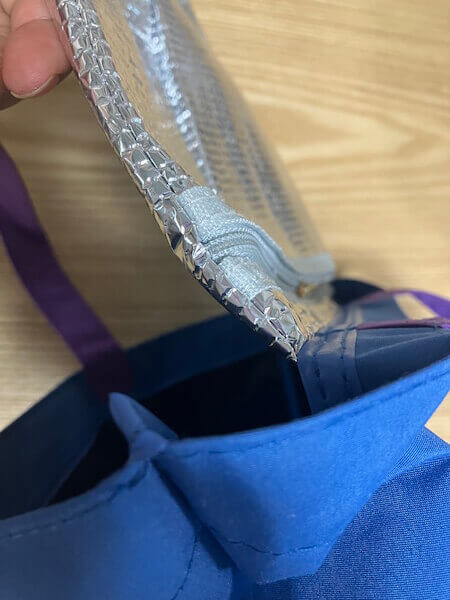 保冷バッグがバッグの片側についています。バッグと一体型のデザインのため、保冷バッグのみを取り外して使用することはできません。保冷バッグの入口は広く、マチも6cmあるため、収納力はあります。ゴディバの定番チョコレートが2箱入るそうです。