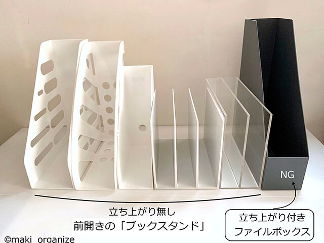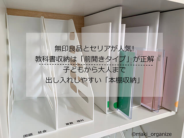 サイゾーウーマン暮らし住まい教科書収納ポイント10選! 暮らし 伊藤まきの「お片付けSOS」相談! 教科書収納は無印とセリアが正解! 片付けプロが教える「出しやすい」アイデア10選 2023/04/25 17:44 伊藤まき(収納ライター) 「お片付け・お掃除SOS」伊藤まき 整理収納アドバイザーの伊藤まきが、片付けに訪問した現場で「よくやる作業」「よく伝えるおすすめ収納法」やおすすめアイテムを紹介していきます! 前回に引き続き、春の新生活を応援する「本棚収納」を紹介します。書類や資料など「紙モノ」の収納方法は、使用頻度によって変わってきます。今回は、毎日出し入れする「教科書の収納」に特化した内容です! 非公開: 「ランドセル収納」はIKEAワゴンが最強! 片付けのプロが教える失敗しない使い方とは?整理収納アドバイザーの伊藤まきが、片付けに訪問した現場で「よくやる作業」「よく伝えるおすすめ収納法」やおすすめアイテムを紹介していきます! 新生活が始まる春になると「ラ...サイゾーウーマン2023.04.18 ブックスタンドとラベリングがカギ(C)maki_organize 毎日使う教科書は、棚から迷わずに「ワンアクション」で出し入れできると◎。快適さのカギとなる「ブックスタンドの選び方」と「ラベリングの作り方」を、10つのポイントに分けて紹介します。 【教科書収納ポイント1】本棚の「高さ」と「横幅」にも注意! 教科書が入らないカラーボックスも(C)maki_organize まず、本棚の「棚板間隔の高さ」を確認します。例えば、ニトリのカラーボックスは高さ調整可能ですが、一般的なカラーボックスだと平均的な高さが27.5cmなので、A4判の教科書 (H29.7cm)が入りません。また、「横幅(サイドの棚)」も測ると良いです。 【教科書収納ポイント2】ブックスタンドは「前開きタイプ」が正解 倒れにくい出しやすいのは無印良品です(C)maki_organize 本立てにも、いろいろな種類があります。書籍が倒れないように抑えるなら「スチール製のブックエンド」。家の重要書類を保管するなら「立ち上がり付きのファイルボックス」。毎日出し入れするなら、「前開きタイプのブックスタンド」を選びましょう。 【教科書収納ポイント3】連結型のブックスタンドは、幅と厚みが大事 筆者の一番のおすすめは左端(C)maki_organize 3種類とも筆者宅で実際に使っている、連結型のブックスタンドです。100均の2倍以上の価格ですが、しっかり自立して崩れません。文具メーカーの商品もありますが、スタンドの幅(A)と厚み(B)で選ぶと快適な出し入れがしやすいです。スリムな教科書なら、幅が狭いほど◎。厚みも薄いほうが引っ掛からず済みます。 写真左から ・無印良品「アクリル収納スタンド・A5サイズ」廃盤 ・無印良品「スチロール仕切りスタンド・WHグレー」品番:02856427 ・ニトリ「ブックスタンド」品番:8731486 次のページ 【教科書収納ポイント4】ブックスタンドの素材は硬質なほど◎ 123次のページ 関連記事 「ランドセル収納」はIKEAワゴンが最強! 片付けのプロが教える失敗しない使い方とは?片付け専門家が教える「衣替え」のコツ7つ! ダイソーやSHEINアイテムで冬物収納疲れない大掃除テク! オキシクリーンでトースターの真っ黒な焦げ、洗濯槽や浴室のカビもスッキリダイソー「本当に使える」収納アイデア31選! プロがおすすめ最新アイテムまとめ【2022年11月最新版】ダイソー「ワイヤーバスケット」活用アイデア6選! たった800円でデッドスペースやランドリー用品がスッキリ