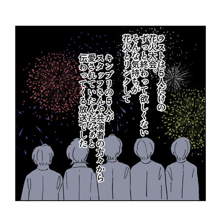 サイゾーウーマン男性アイドルSTARTO(旧ジャニーズ)King&Prince『キンプる』で見た5人の愛され度 男性アイドル [ジャニオタ漫画家・竜田トキヒロの“推し事”見聞録]vol.10 【ジャニオタマンガ】『King&Princeる。』最終回で見た、メンバー5人の愛され度 2023/05/31 21:00 竜田トキヒロ(マンガ家) King&Prince竜田トキヒロの“推し事”見聞録 ――Twitterで日々、ジャニーズタレントにまつわるイラストを投稿中のジャニオタ漫画家・竜田トキヒロが、現場レポートからドラマや映画、番組レビューまで、“推し事”の様子をお届け! 今回は、5月20日に放送されたKing&Princeの冠番組『King&Princeる。』(日本テレビ系)2時間SPをプレイバック。22日に、平野紫耀、神宮寺勇太、岸優太の3人がグループを脱退したことから、最終回となったこの日の放送では、「キンプリの夢を叶える“最後の5人旅”」として、新潟県への5人旅(1泊2日)の模様がオンエアされました。 メンバー5人は、大自然の中でサウナ体験や水上相撲を行ったり、ご当地食材を使ったオリジナルピザ作りを体験。最後は彼らだけで花火大会を行い、平野と神宮寺が作った花火玉や、それぞれが思いをつづった花火玉が打ち上り、夜空を綺麗に彩る感動的なフィナーレに。涙なしでは見られなかった2時間SPの中で、特に印象的だったシーンを振り返ります。 サイゾーウーマン ジャニーズ情報専用Twitterアカウント「J担しぃちゃん」オープン フォローはこちらから 【ジャニオタマンガ】Snow Man&SixTONES『少クラ』卒業回をプレイバック!――Twitterで日々、ジャニーズタレントにまつわるイラストを投稿中のジャニオタ漫画家・竜田トキヒロが、現場レポートからドラマや映画、番組レビューまで、“推し事”の様子を...サイゾーウーマン2023.04.12 【ジャニオタマンガ】Snow Man・目黒蓮&原嘉孝、『冒険少年』に見たマブダチムーブとは?――Twitterで日々、ジャニーズタレントにまつわるイラストを投稿中のジャニオタ漫画家・竜田トキヒロが、現場レポートからドラマや映画、番組レビューまで、“推し事”の様子を...サイゾーウーマン2023.04.05 竜田トキヒロ(マンガ家) 漫画家、イラストレーター。育休中に執筆したエッセイ漫画でKADOKAWAコミックエッセイ大賞受賞。Ameba、ライブドア公式ブロガーを経たのち現在はインフルエンサーとしてエンタメ、オタクに特化した漫画やイラストや体験ルポ等幅広く執筆。著書『コミュ障母さんとごきげん娘』(KADOKAWA) X:@musumenuma 最終更新:2023/06/01 12:53 最終回、永久保存版でした 関連記事 キンプリ・永瀬廉、最終日に岸優太を「怒りました」と告白――その理由とは?【ジャニオタマンガ】Snow Man・ラウールにもらい泣き! 『滝沢歌舞伎ZERO FINAL』レポ【ジャニオタマンガ】美 少年の“距離感”がバグ? ドラマ『春は短し恋せよ男子。』をレビュー!【ジャニオタマンガ】SixTONESが初ドームでマッドマックス化? 『慣声の法則』参戦レポ【ジャニオタマンガ】HiHi Jetsの魅力は「少年漫画」感――5人のステマシート大公開! 次の記事 なにわ・西畑の“なかなか見られない姿” >