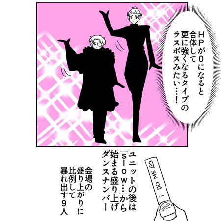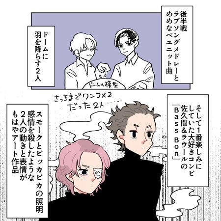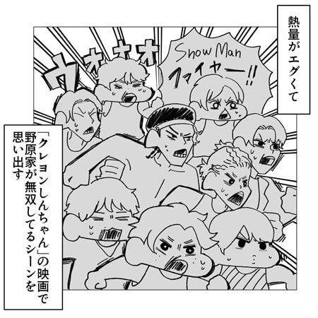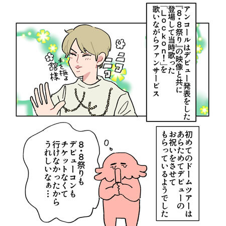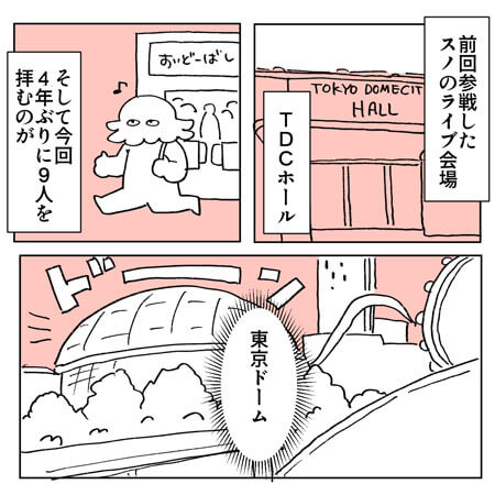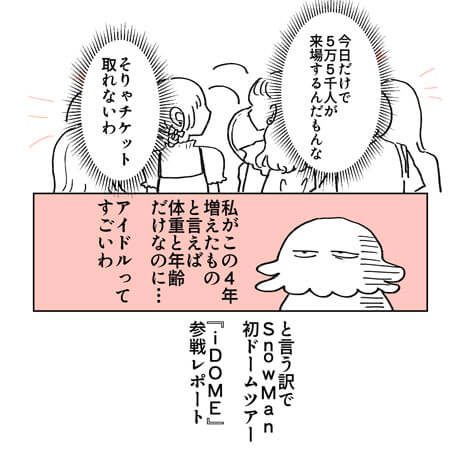 サイゾーウーマン男性アイドルSTARTO(旧ジャニーズ)Snow Manスノドーム公演、さくラウはまるでラスボス? 男性アイドル [ジャニオタ漫画家・竜田トキヒロの“推し事”見聞録]vol.13 【ジャニオタマンガ】Snow Manドーム公演レポ――ラウール&佐久間大介はまるでラスボス? 2023/06/21 21:00 竜田トキヒロ(マンガ家) Snow Man竜田トキヒロの“推し事”見聞録 ――Twitterで日々、ジャニーズタレントにまつわるイラストを投稿中のジャニオタ漫画家・竜田トキヒロが、現場レポートからドラマや映画、番組レビューまで、“推し事”の様子をお届け! 今回は、Snow Manにとって初の4大ドームツアー『Snow Man 1st DOME tour 2023 i DO ME』から、6月12日に行われた東京公演最終日の模様をレポート。2019年8月8日開催のコンサート『ジャニーズJr.8・8祭り ~東京ドームから始まる~』でデビュー発表を行った彼らが、単独で思い出の地に帰ってくるということで、本人たちはもちろん、ファンにとっても感慨もひとしおな公演となりました。 サイゾーウーマン ジャニーズ情報専用Twitterアカウント「J担しぃちゃん」オープン フォローはこちらから 【ジャニオタマンガ】Snow Man・ラウールにもらい泣き! 『滝沢歌舞伎ZERO FINAL』レポ――Twitterで日々、ジャニーズタレントにまつわるイラストを投稿中のジャニオタ漫画家・竜田トキヒロが、現場レポートからドラマや映画、番組レビューまで、“推し事”の様子を...サイゾーウーマン2023.05.25 【ジャニオタマンガ】Snow Man&SixTONES『少クラ』卒業回をプレイバック!――Twitterで日々、ジャニーズタレントにまつわるイラストを投稿中のジャニオタ漫画家・竜田トキヒロが、現場レポートからドラマや映画、番組レビューまで、“推し事”の様子を...サイゾーウーマン2023.04.12 【ジャニオタマンガ】Snow Man・目黒蓮&原嘉孝、『冒険少年』に見たマブダチムーブとは?――Twitterで日々、ジャニーズタレントにまつわるイラストを投稿中のジャニオタ漫画家・竜田トキヒロが、現場レポートからドラマや映画、番組レビューまで、“推し事”の様子を...サイゾーウーマン2023.04.05 竜田トキヒロ(マンガ家) 漫画家、イラストレーター。育休中に執筆したエッセイ漫画でKADOKAWAコミックエッセイ大賞受賞。Ameba、ライブドア公式ブロガーを経たのち現在はインフルエンサーとしてエンタメ、オタクに特化した漫画やイラストや体験ルポ等幅広く執筆。著書『コミュ障母さんとごきげん娘』(KADOKAWA) X:@musumenuma 最終更新:2023/06/21 21:00 ネガティブな話題も多いけど、コンサート自体は大盛り上がり! 関連記事 【ジャニオタマンガ】コンサートでは盛り髪&花冠、イッピ袋も! 懐かしきオタク文化【ジャニオタマンガ】美 少年は全員癖つよ――新参者が見た6人の“推しポイント”は?【ジャニオタマンガ】『King&Princeる。』最終回で見た、メンバー5人の愛され度【ジャニオタマンガ】Snow Man・ラウールにもらい泣き! 『滝沢歌舞伎ZERO FINAL』レポ【ジャニオタマンガ】7 MEN 侍・佐々木大光に全人類が恋!? 『GYPSY』観劇レポ 次の記事 キンプリ新曲、スト新曲を上回る! >