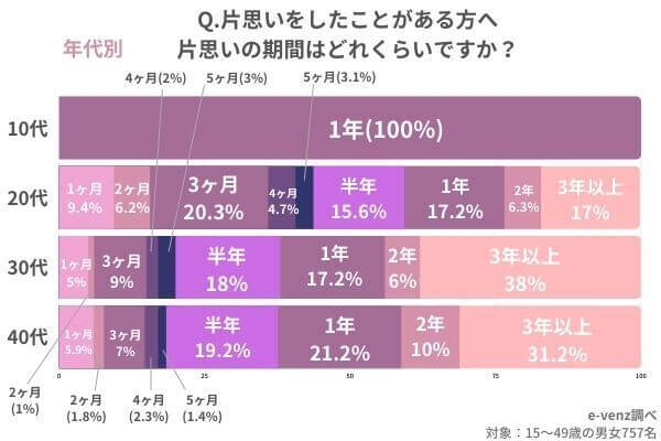 サイゾーウーマンカルチャー片思いの期間ってどれくらい?【男性の本音】【女性の本音】【ラインの頻度】【諦め方】までを徹底調査 カルチャー 片思いの期間ってどれくらい?【男性の本音】【女性の本音】【ラインの頻度】【諦め方】までを徹底調査 2023/07/02 12:15 サイゾーウーマン編集部(@cyzowoman) 写真ACより 婚活・恋活や街コンなど中心とする男女の出会いメディア「e-venz」(イベンツ)を運営するノマドマーケティング株式会社(所在地:東京都渋谷区、代表取締役:三輪賢治)では、全国の1,000名の男女(15歳~49歳)を対象に片思いの割合から【期間】【男性の本音】【女性の本音】【ラインの頻度】【諦め方】についてのアンケートを実施しました。 これまでに片思いをした経験がある人の割合はどのくらいなのでしょうか。 今回「e-venz」では1,000名の男女にアンケート調査を行いました。 ・アンケート内容 ●これまでに片思いをしたことはありますか? ・はい ・いいえ [対象者] 調査対象:全国15歳~49歳の男女 ・調査サマリー 今回の調査では片思いをしたことがある人の割合は76%、片思いをしたことがない人の割合は24%でした。男女別のデータでは片思いをしたことがある男性は73%、女性は78%となり、男性より女性の方が片思い経験がある人が若干多いことが分かりました。 【アンケート調査概要】 調査方法:インターネットアンケート 調査期間:2021年9月21日~2021年9月21日 調査対象:全国15歳~49歳の男女 有効回答数:1,000(男性501名・女性499名) では、片思い中の相手に対する心理とはどのようなものなのでしょうか。 片思い経験がある人に尋ねてみました。 Q.「片思いをしたことがある」と回答された男性へ 片思い中の相手に対してどのような心理になりましたか? ・「ドキドキする」(37歳/東京都) ・「毎日ワクワク」(38歳/大阪府) ・「相手との接点を持ちたい」(41歳/東京都) ・「緊張する」(39歳/茨城県) ・「話しかけづらくなりかえって距離が離れてしまいます」(49歳/埼玉県) ・「なかなかしんどい」(41歳/神奈川県) ・「眺めているだけで良い」(30歳/大阪府) ・「とてもつらく苦しい」(48歳/北海道) ・「心臓がきゅっとなる」(38歳/新潟県) 「ドキドキする」「毎日ワクワクする」など、片思いを楽しんでいる男性もいる一方、「しんどい」「とても苦しい」など、好きだからこそつらいと感じている人の声も目立ちました。 Q.「片思いをしたことがある」と回答された女性へ 片思い中の相手に対してどのような心理になりましたか? ・「意識しすぎてわざと避けたりしてしまう」(27歳/福岡県) ・「恥ずかしくて話かけられない」(47歳/東京都) ・「近付きたいけど近付けない」(41歳/京都府) ・「学校などで、廊下やイベントなどで相手を見たい」(35歳/静岡県) ・「自分が好きだということをバレたくない」(38歳/東京都) ・「思いが伝えられなくて苦しい」(29歳/千葉県) ・「何故か相手と顔を合わせたくなくなる」(41歳/東京都) ・「頭から離れない」(48歳/埼玉県) ・「相手に気に入られたい」(49歳/京都府) ・「会えたらその日一日嬉しい、何とも思っていない人なら気軽に誘えるのにどうしても誘えない」(48歳/千葉県) 女性心理としては、片思い中の相手を意識しすぎて「好き避け」してしまう人が多い傾向がありました。「近づきたいのに近づけない」「思いが伝えられなくて苦しい」など、もどかしい気持ちになっている女性が多いことが分かります。 「告白する」or「諦める」どちらにしても、片思いはどれくらいの期間継続するべきなのでしょうか。 e-venzでは、片思いをしたことがある男女に片思い期間についてアンケート調査を行いました。 Q.片思いをしたことがある方へ 片思いの期間はどれくらいですか? 今回の調査では、なんと「片思い期間3年以上」という人が最も多い割合となりました。 一度好きになった相手のことを長い間思い続ける方が多いことが分かります。 また、年代別に見ると10~20代よりも30~40代のほうが長期間片思いする方が多い傾向があります。 ただ、片思い期間はあまり長くならない方が良いでしょう。 なぜなら、続けば続くほど「叶わない」という思いが強くなり、自分自身が踏み出せなくなる可能性が高いからです。 上記のアンケート調査では3年以上片思いする人が多いことが分かりましたが、連絡頻度はどのくらいなのでしょうか。 今回はそのあたりについても調査してみました。 Q.片思いをしたことがある方へ 片思い中の相手へのLINEの頻度はどれくらいですか? 片思いの相手へのラインの頻度は月に1回が64%と最も多い結果となりました。 「毎日」と答えた方はわずか8%にとどまっていて、控え目な方が多いようですね。 ちなみに年代別では、月に1回と答えた方は以下の割合となっています。 ・10代:0% ・20代:47% ・30代:51% ・40代:71% 以上の結果から、年代が上がるほど片思いの相手への連絡頻度が下がることが分かります。 片思いの相手とのラインの頻度は「絶対毎日!」「週に1回は必ず!」などこちら