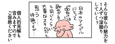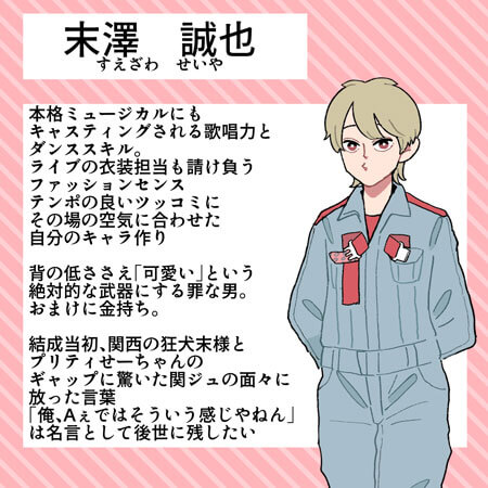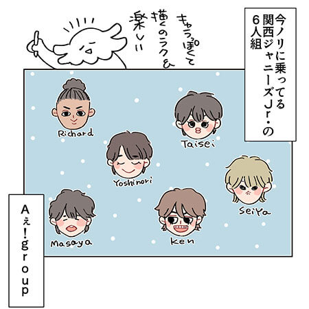 サイゾーウーマン男性アイドルSTARTO(旧ジャニーズ)なにわ男子西畑大吾Aぇ! group6人の個性とは? 男性アイドル [ジャニオタ漫画家・竜田トキヒロの“推し事”見聞録]vol.15 【ジャニオタマンガ】Aぇ! groupは「高スキル集団」! キャラの濃い6人の個性とは? 2023/07/05 21:00 竜田トキヒロ(マンガ家) ジャニーズJr.Aぇ! group竜田トキヒロの“推し事”見聞録 ――Twitterで日々、ジャニーズタレントにまつわるイラストを投稿中のジャニオタ漫画家・竜田トキヒロが、現場レポートからドラマや映画、番組レビューまで、“推し事”の様子をお届け! HiHi Jets、美 少年と共に“次期デビュー候補”と目され、先日ニュースサイト「文春オンライン」にて、デビューが決定したと報じられた、関西ジャニーズJr.の6人組ユニット・Aぇ! group。ジャニーズJr.は、東西約200人が集まるコンサート『ALL Johnnys’ Jr. 2023 わっしょいCAMP! in Dome』を京セラドーム大阪(7月16、17日)と東京ドーム(8月19、20日)で開催予定とあって、公演中にデビューが発表されるのではないかと、ファンの注目が集まっています。 そこで、今回はAぇ! groupメンバー一人ひとりの個性やエピソードをまとめた“ステマシート”とともに、グループの魅力をご紹介します。 Aぇ! group、ボケてツッコんで体も張る「高スキル集団」! 次のページ Aぇ! group・小島健は「顔面ルーブル美術館」? 12次のページ 関連記事 【ジャニオタマンガ】なにわ男子・西畑大吾主演映画『忌怪島』、“厄介オタク”登場で怖さ半減?【ジャニオタマンガ】Snow Manドーム公演レポ――ラウール&佐久間大介はまるでラスボス?【ジャニオタマンガ】コンサートでは盛り髪&花冠、イッピ袋も! 懐かしきオタク文化【ジャニオタマンガ】美 少年は全員癖つよ――新参者が見た6人の“推しポイント”は?【ジャニオタマンガ】『King&Princeる。』最終回で見た、メンバー5人の愛され度