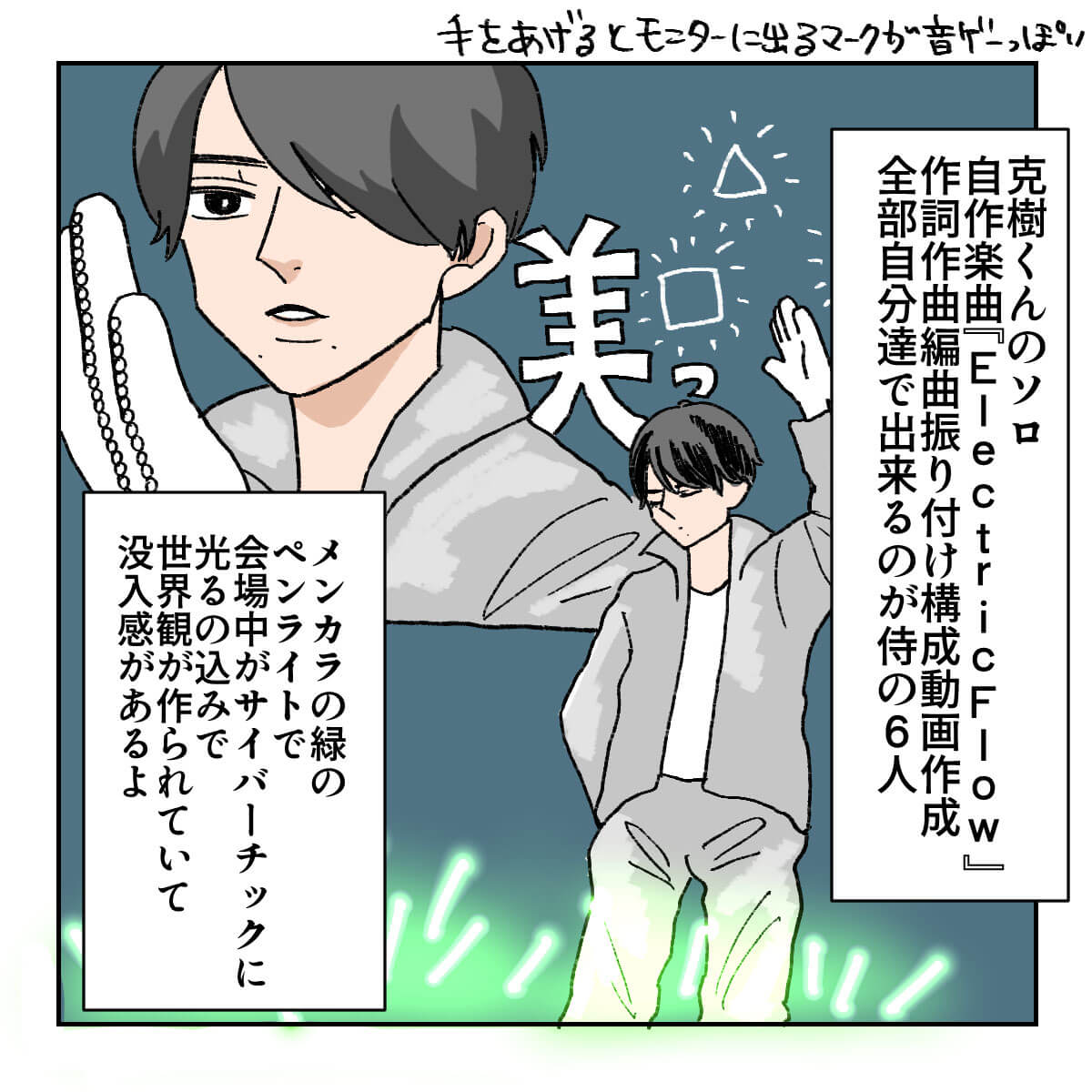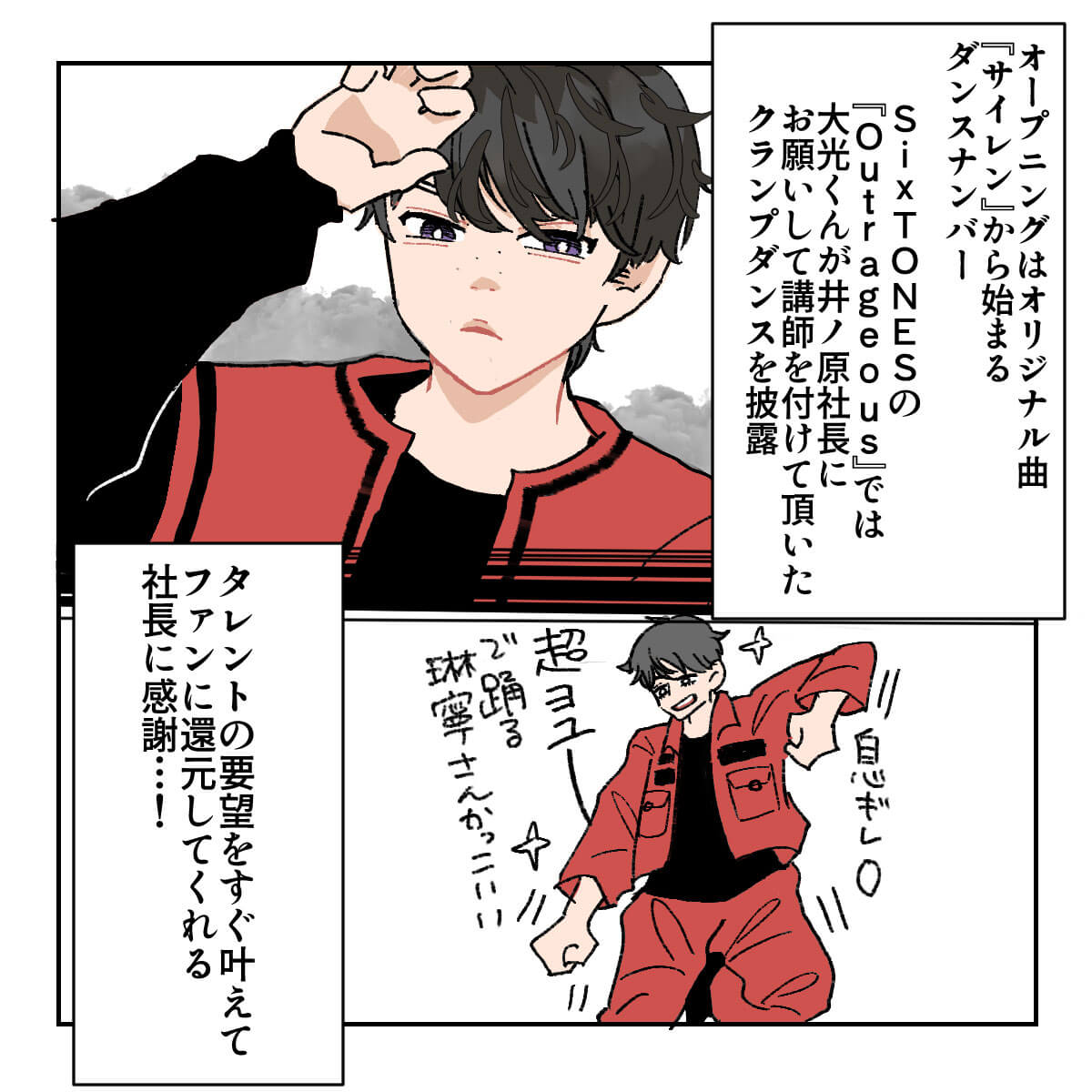 サイゾーウーマン男性アイドルSTARTO(旧ジャニーズ)ジュニア7 MEN 侍7 MEN 侍『サマパラ』レポ 男性アイドル [ジャニオタ漫画家・竜田トキヒロの“推し事”見聞録]vol.17 【ジャニオタマンガ】井ノ原快彦社長に思わず感謝? ジャニーズJr.・7 MEN 侍『サマパラ』レポ 2023/08/02 21:00 竜田トキヒロ(マンガ家) ジャニーズJr.7 MEN 侍竜田トキヒロの“推し事”見聞録 ――Twitterで日々、ジャニーズタレントにまつわるイラストを投稿中のジャニオタ漫画家・竜田トキヒロが、現場レポートからドラマや映画、番組レビューまで、“推し事”の様子をお届け! 今回は、ジャニーズJr.内ユニット・7 MEN 侍が7月23日からTOKYO DOME CITY HALLにて開催中の単独公演『Summer Paradise 2023 Make 侍 Noise』の参戦レポートです。 『Summer Paradise』(通称『サマパラ』)は、毎年夏に行われている、ジャニーズファンにとってはおなじみのライブ。7 MEN 侍は2020年に初出演しましたが、コロナ禍ということもあり、無観客のオンライン配信に。21年と22年の公演には出演していないため、『サマパラ』でファンの前に立つのは今回が初めてとなります。 念願のステージでどんなパフォーマンスを行ったのか――中村嶺亜、菅田琳寧、本高克樹、佐々木大光、今野大輝、矢花黎、メンバーそれぞれの見どころとともに紹介していきます! 7 MEN 侍の『サマパラ』で、井ノ原快彦社長に思わず感謝 次のページ 7 MEN 侍・佐々木大光から伝わる、SixTONES・ジェシー愛 123次のページ 関連記事 【ジャニオタマンガ】『トリリオンゲーム』第1話、Snow Man・目黒蓮と主人公の“共通点”とは?【ジャニオタマンガ】Aぇ! groupは「高スキル集団」! キャラの濃い6人の個性とは?【ジャニオタマンガ】なにわ男子・西畑大吾主演映画『忌怪島』、“厄介オタク”登場で怖さ半減?【ジャニオタマンガ】Snow Manドーム公演レポ――ラウール&佐久間大介はまるでラスボス?【ジャニオタマンガ】コンサートでは盛り髪&花冠、イッピ袋も! 懐かしきオタク文化