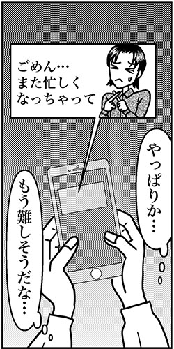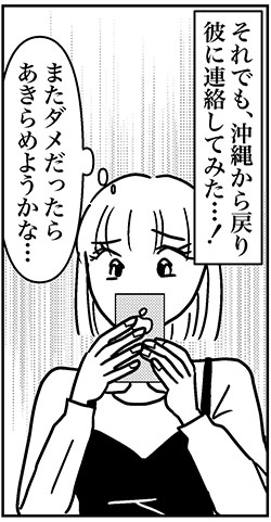 サイゾーウーマンカルチャーマンガアラフォー婚活、最後に恋したのって…… カルチャー まんが『オバサンと言われても結婚したい!』266話 【アラフォー婚活ルポ】最後に本気で恋したのっていつだっけ? 彼からの連絡が途切れ…… 2023/08/27 13:30 白戸ミフル(マンガ家) オバサンと言われても結婚したい! ――合コン歴20年以上、累計回数2,500回以上、30代なかばに乳がんで闘病するも、現在は絶賛婚活中のライター・漫画家の白戸ミフルが「アラフォー婚活」の実体験をほぼリアルタイムでお届けします! アラフォー中の結婚は成就するのか……!? 【前回まで】 20代男子にセフレにされかけた痛い経験をバネにして「婚活の鬼」になった私。マッチングアプリを中心に行動中! 向こうからのアピールでいい感じだった彼だが、予定が合わず会えない日々が続く。そして、次第に連絡が途切れるように……。 266話『最後に本気で恋したのっていつだっけ? 彼からの連絡が途切れ……』 次のページ 私には時間がない 123次のページ Yahoo 乳がんステージ4だった私が、それでも合コンに行きまくって救われた話 コミックエッセイ/白戸ミフル(著者) 関連記事 【アラフォー婚活ルポ】アプリで出会った彼氏とスピード破局! イケメンだったのに惜しいことした?【アラフォー婚活ルポ】アプリ婚活を再開! コミュニティで共通の話題のある人を探す!【アラフォー婚活ルポ】なんつーイケメン!!! 銀座に降臨した美しき婚活男性【アラフォー婚活ルポ】39歳でフラれた私は「鬼」になった! 恋愛してやる!! 【アラフォー婚活ルポ】結婚相談所の紹介は○○……アラフォー3人、2021年の婚活を振り返る! その他の作品を読む