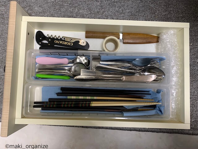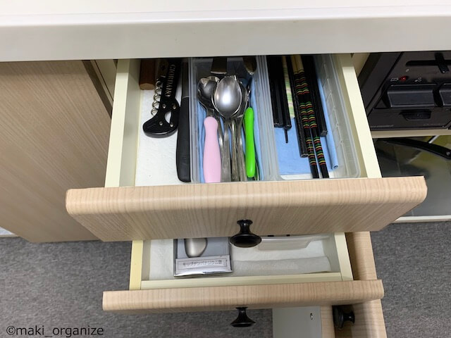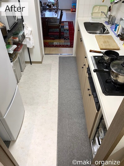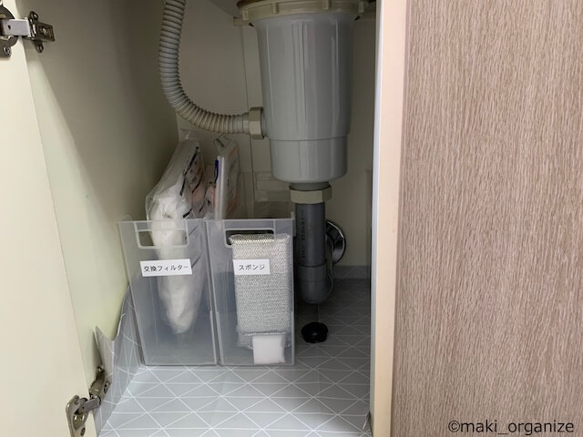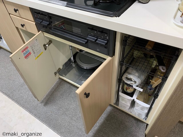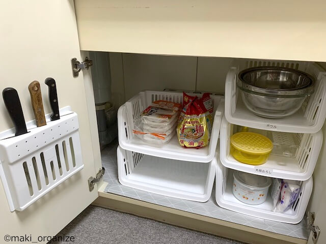 サイゾーウーマン暮らし住まいキッチン掃除が劇的ラクになる収納テク 暮らし [連載]女たちの「煩悩部屋」ビフォーアフター 【ダイソー・セリアほか100均だけ】キッチン掃除が劇的ラクになる収納アイデア4選 2023/11/28 17:00 伊藤まき(収納ライター) 「汚部屋」ビフォーアフター 【ダイソー・セリアほか100均だけ】高齢者向けキッチン収納法のコツ7 【高齢者のキッチン収納のコツ1 コンロ回り】調味料は全部出しておく 冷蔵保管の調味料があっても、住人が使いやすい方法を優先に(C)maki_organize シニアの一人暮らしなので、調味料は「ぜんぶ見える平置き」に。冷蔵庫の中に保存してほしい醤油も、しまいこんだら忘れるので出してあります。トレーにまとめることで、調理台の掃除がしやすくなります。 【高齢者のキッチン収納のコツ2 コンロ周り】キッチンツールは「吊るす」 セリアのほか、ダイソーとSHEINでも売っています(C)maki_organize キッチンツールは、セリアの「戸棚下ツールフック」へ。油が霧のように付きまといますが、高齢者には「吊るす収納」が一番優しいです。洗って干すだけなので、片付けも簡単です。 【高齢者のキッチン収納のコツ3 戸棚の中】ダイソーのジョイントラック 扉が付いていると忘れるので、あえて外して使う(C)maki_organize 高齢者の場合、扉の中のモノは「基本的に忘れがち」。そのため、扉はあえて外して使います。戸棚の中はすべて、ダイソー「ジョイントラック」で段を作りました。 非公開: ダイソー「ジョイントラック」、激安で便利棚が完成! プロの使い方5パターン【全サイズ・色】整理収納アドバイザーの伊藤まきが、片付けに訪問した現場で「よくやる作業」「よく伝えるおすすめ収納法」を【プロの技】シリーズとして紹介していきます! ダイソー【ジョイントラ...サイゾーウーマン2022.04.11 奥と手前にラックを2つ配置すれば、収納力アップ(C)maki_organize フライパンや鍋の収納も、ダイソー「ジョイントラック」にしました。このセットで、1,200円(税抜)の予算。シンク用の伸縮ラック棚も激安ショップなら、1,000円前後で用意できます 【高齢者のキッチン収納のコツ4 シンク下】扉を開けるだけで在庫確認 クリーニングした後は、アルミシートを敷いて汚れブロック(C)maki_organize シンク下は、透明のマガジンボックスで消耗品を収納。中身が見えるので、扉を開けるだけで在庫確認ができます。 【高齢者のキッチン収納のコツ5 シンク下】ワッツ「のせのせストッカー」 退去時を考えると、プラスチックか木製が楽です(C)maki_organize 広い空間を最安で「仕切り棚」にするなら、ワッツ「のせのせストッカー」がおすすめ。収納力や使い勝手は普通ですが、一番安く段差を作ることができます。また、カッターでキレるので処分しやすいプラスチック製です。 【高齢者のキッチン収納のコツ6 引き出し】カトラリーケースは「イノマタ化学」 水切れが悪いまま戻すので、吸水シートを敷く(C)maki_organize 引き出しの仕切りは、イノマタ化学の「キッチントレー」がおすすめです。筆者はいつもコレ一択! 一体型ではないシンプルな形状なので、縦・横どちらでも使うことができます。セリア、キャンドゥ、ワッツで購入できます。 食器は、溜め込んでから洗うので少し多めに残す(C)maki_organize 100均の「キッチントレー」のサイズが、引き出しより小さい場合は余白が出ます。そんな時は、エアパッキンが便利。軽い素材のキッチントレーが、浮いたりズレたりする場合は「滑り止めマット」を用意しても可。予算を0円にしたいときは、牛乳パックを加工してトレーを作ります。 【高齢者のキッチン収納のコツ7 吊り戸棚】シニア世代は「使わない」が基本 高齢世代は腕の上げ下げが苦手になる(C)maki_organize 高齢者になると、吊り戸棚は使いません。シンク上の戸棚のみ、使いやすく忘れにくいので、使用頻度が低い道具を収納しました。ほかはすべて、空っぽです。 【キッチン収納 After】汚れにくい、散らかしにくいキッチンへ 700円のキッチンマットを、2枚持ちで洗濯交換(C)maki_organize モノが少なくわかりやすい収納であれば、 物忘れが増える高齢者でも「汚れにくいキッチン」になります。 よく使っているモノ、これまでの動作(癖)をよく見て「 暮らす人に合わせた収納」であれば、 大きく散らかることはありません。新しい家に引っ越してから、 1年経過しましたが「1カ月に一度の掃除訪問」 も簡単に済むようになりました。 中古マンションの洗面所リメイク編【ビフォーアフター】 ※写真クリックで記事に飛びます 中古マンションの洗面所をリメイク「黒カビ」と「黄ばみ」が強く、色のトーンが重たく感じる洗面台下の収納 中古マンションの洗面所をリメイクSHEINの防水リメイクシートを貼ることで、水拭きもできる床材に大変身。排水管まわりの「隙間穴」を「エアコン配管用パテ(粘土)」で埋めると、虫の侵入ルートを防げます。 中古マンションの洗面所をリメイク引き出し