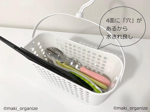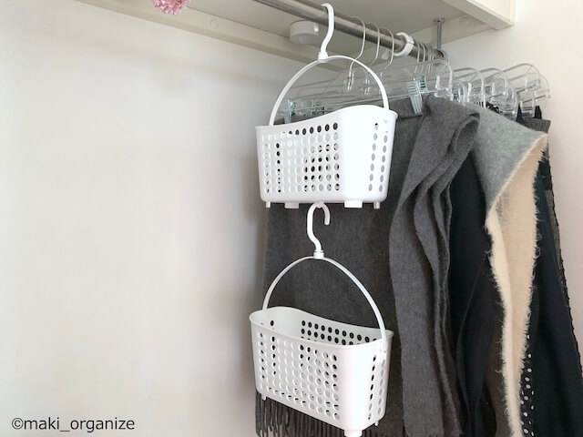 サイゾーウーマン暮らし100均・雑貨【セリア】110円「穴あきバスケット」名品 暮らし 【セリア】収納アイデア 【セリア】110円「穴あきバスケット」、圧倒的に便利な名品! プロの使用実例10 2023/12/26 13:00 伊藤まき(収納ライター) 伊藤まきの「お片付けSOS」相談 セリア店内(C)サイゾーウーマン 整理収納アドバイザー・伊藤まきさんがサイゾーウーマンで連載中の「『お片付けSOS』相談!」。今回はセリアの「穴あきバスケット」を再掲します。プロの収納実例は? ※2022年5月16日の記事を再編集したものです。 ※最新情報は公式サイトでご確認ください。 セリア「穴あきバスケット」 3つともイノマタ化学株式会社の製品です。それぞれ110円(C)maki_organize プロの技シリーズ14回目は、セリアとワッツで買える「穴あきバスケット」。実際の商品名は、洗濯用の「ピンチバスケット」「ピンチバスケット ワイド」と、お風呂のボトル収納に適した「ハンキングバスラック」になります。洗濯コーナーや、バス用品コーナーに置かれているアイテムで、ボックスに「穴」があるため、水周りに強い収納ができます。 しかも「吊るす」収納ができるので、狭さに悩む家でも自由にスッキリと使用可能。今回は、これらのリアルな使用例を10パターン紹介します。 その前に、これら3種類の「穴あきバスケット」の特徴を紹介。共通するポイントが6つあります。 【1】老舗の「イノマタ化学株式会社」の製造品 【2】バスケットに「穴」があいている 【3】しっかりした「耐荷重」がある 【4】引っ掛けて「浮かす収納」ができる 【5】内側に「埃が溜まらない」ので衛生的 【6】湿気がひどい場所にも「通気性」が良い 中でも一番の特徴は【2】。バスケットの底面に穴があいているため「水切れが抜群」です。穴の数が多いほど、水切れが良く清潔! 洗濯ピンチやバス小物だけじゃない便利な使い方ができます。 (C)maki_organize それでは、筆者宅での使用例など、10パターン紹介します。 セリア「穴あきバスケット」使用例.1:お風呂場のボトル収納に (C)maki_organize 「ハンギング バスラック」。こちらは、セリアとワッツのバス小物エリア(ライター調べ)で買えます。 フックが2つある、シャンプーボトル専用のラック。横ブレせず、安定します。ただし、引っ掛けるためのバー(直径25mmまで)が必要です。 フックが1つなので、省スペースでOK!(C)maki_organize こちらのピンチバスケット2種は、バス洗濯用品エリア(ライター調べ)にあります。フックを引っ掛ける場所をとらないので、1本のバーに何個も吊るせます。軽めの小物ならピンチバスケットのほうが便利です。 セリア「穴あきバスケット」使用例.2:ランドリー小物の「浮かし収納」に 置く収納より、ずっとわかりやすい(C)maki_organize 洗濯ネットや固形石鹸など「ランドリー小物」を衛生的に「浮かす収納」ができます。突っ張りラックはもちろん、蛇口まで「引っ掛けるところ」があれば大丈夫! セリア「穴あきバスケット」使用例.3:バスルーム小物の収納に ペット用シャンプーグッズ入れに使用中(C)maki_organize ピンチバスケットに重さのあるボトルを入れると不安定になりますが、バスケットごと取り出す場合には便利! ボトルより軽量の子どものおもちゃ、靴洗いセット、入浴剤、洗顔用品など「軽めの小物」を吊るすのにおすすめです。 お風呂にバーの設置がない場合は、窓枠突っ張り棒や鴨居フックを付ければOK。しっかり、乾燥できるのでヌメヌメ汚れ問題もスッキリします。 セリア「穴あきバスケット」使用例.4:トイレの「衛生用品」も死角にスッキリ トイレの隅は、埃が溜まりやすい(C)maki_organize トイレに収納がなくても、便器があればOK! セリアの「何度でも貼ってはがせる フィルムリングフック」に引っ掛けて、お掃除グッズを用意できます。また、ピンフックや突っ張り棒でも簡単に吊るせます。トイレは「埃が溜まりやすい」ので、穴のあいたバスケットなら衛生的。 セリア「穴あきバスケット」使用例.5:玄関まわりの「小物入れ」の定位置に 100均の石膏ボード用ピンフックに掛けて(C)maki_organize 玄関まわりで「毎日使う小物」も、「ここにあったら便利」という場所へ置くことができます。例えば、マスクやハンカチの用意などサッと取り出したい小物ってありますよね。 また、日本には四季があるので「季節の小物」も衣替えのように用意するとゴチャつきません。夏は、虫除けや日焼け止め。冬は、手袋やホッカイロなど用意しておくと◎です。 セリア「穴あきバスケット」使用例.6:掃除グッズを「通り道」にスタンバイ 床の直置きと比べて、汚れが出ない(C)maki_organize 写真上は、筆者宅の「階段の踊り場」です。階段を昇りながら、掃除シートで埃取りをする用意をしています。壁側に「吊るす収納」なので、場所を奪わず邪魔になりません。このような「ついで掃除グッズ」を用意しておくと、掃除道具を出す手間・取りに行く面倒が省けます。 セリア「穴あきバスケット