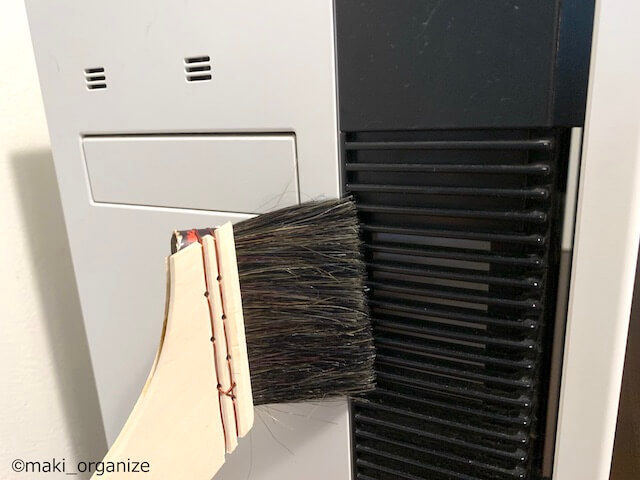 サイゾーウーマン暮らし住まい【ダイソー】「万能用ハケ」110円、黒カビ除去 暮らし 伊藤まきの「お片付けSOS」相談! 【ダイソー】110円「万能用ハケ」が黒カビ除去に最強! プロ直伝の掃除テクニック集 2023/12/26 17:00 伊藤まき(収納ライター) 「お片付け・お掃除SOS」伊藤まき 整理収納アドバイザー1級、クリンネスト2級の資格を持つ「掃除をしながら片付ける」伊藤まきさんが、ダイソー商品を使ったプロ技を紹介していきます! (C)maki_organize あっという間に、年末の大掃除の時期です。今回はダイソーとセリアの「刷毛」を使った掃除術を取り上げます。 写真上は、家具の塗装などでおなじみの「刷毛」。掃除のプロたちも、サッと出して使える道具として重宝しています。ホウキや掃除機よりもずっとコンパクトなので、場所をとらずに素早くホコリ払いができます。 目次 ・【ダイソー】油性用ハケ、万能用ハケ110円 ・【セリア】油性水性兼用刷毛、多用途刷毛110円 ・ダイソー「黒い刷毛」使用法1:家電の「詰まり汚れ」落としに ・ダイソー「黒い刷毛」使用法2:空気清浄機の「排気口」のお手入れに ・ダイソー「黒い刷毛」使用法3:サッシの「普段のお手入れ用」に! ・ダイソー「黒い刷毛」使用法4:玄関と室内のドア「蝶番まわり」に ・ダイソー「黒い刷毛」使用法5:天井まわりの「目の届かない場所」に ・ダイソー「黒い刷毛」使用法6:車の中と外の、あらゆる隙間に! ・ダイソー・セリア「白い刷毛」使用法:黒カビ掃除に! ・【黒カビ除去掃除】Before ・【黒カビ除去掃除】step1:水200mLに対し漂白剤が10ml ・【黒カビ除去掃除】step2:白い刷毛で漂白剤を塗布 ・【黒カビ除去掃除】step3:マイクロファイバータオルで水拭き ・【黒カビ除去掃除】After ・【黒カビ除去掃除】自力で作業するときの注意点 ダイソー・セリアの刷毛 【ダイソー】油性用ハケ、万能用ハケ110円 (C)maki_organize ダイソーとセリアDIYコーナーへ行くと、刷毛の横幅30〜70mmのサイズがそろいます。 ダイソーは黒(油性用ハケ)と白(万能用ハケ)の取り扱いで、セリアは白(兼用)。どちらもペイントが主な目的ですが、セリアだけ「多用途刷毛」があります。 【セリア】油性水性兼用刷毛、多用途刷毛110円 (C)maki_organize セリアとダイソーの違いは「毛量」と「毛の流れ」(C)maki_organize ダイソーのほうが毛量が多いので、小さなほうきのように「ほこり掃除」するのに万能です。セリアは毛量が少なく、毛先がそろうイメージで選び分けます。筆者的には、繊細なPCまわりのホコリ払いはセリアといった感じで、使い分けて選んでいます。なお、掃除に刷毛を使う前は必ず「手でしごいで抜け毛を取る」作業をしてから使います。 では、ダイソーの黒い刷毛を、小さなほうきのように使う「ほこり掃除」方法を紹介します。 ダイソー「黒い刷毛」使用法1:家電の「詰まり汚れ」落としに 水分が入ると、故障やトラブルの原因に!(C)maki_organize 掃除機や調理家電など、ホコリや食品カスが詰まりやすい部分に◎。ネジが多くて、通気口がある家電は「水や洗剤を使ったお手入れNG」なので乾いた布や刷毛を使います。凹凸の多いパーツは、布より「乾いた刷毛」のほうが、詰まった汚れを落とせます。 ダイソー「黒い刷毛」使用法2:空気清浄機の「排気口」のお手入れに モップや綿棒より、刷毛のほうがよく取れる(C)maki_organize 空気清浄機の「排気口」のホコリ取りも、掃除機に付属するブラシより良く取れます。でも、汚れが空中に舞うため掃除機でホコリを吸引しながら作業をする必要があります。 ダイソー「黒い刷毛」使用法3:サッシの「普段のお手入れ用」に! 刷毛の取っ手に穴があるので、フックに掛けられる(C)maki_organize 筆者宅では、「サッシ用の小さなホウキ」としてベランダに常備しています。普段から、サッと砂ホコリを落とせるので汚れがたまるのを阻止できます。 ダイソー「黒い刷毛」使用法4:玄関と室内のドア「蝶番まわり」に とくに、バスルームと玄関の扉が汚れやすい(C)maki_organize 室内と玄関ドアの「蝶番まわり」をはじめ、ドア枠の凹凸部分は「見落としがちな汚れ」がたまっています。おしゃれな「格子デザイン」の扉や引き戸も、ホコリがいっぱいです。 ダイソー「黒い刷毛」使用法5:天井まわりの「目の届かない場所」に モップを交換しなくて済むので楽!(C)maki_organize 部屋の四隅や煙探知機、ブレーカー、ダウンライトなど手が届きにくい「天井まわり」は、汚れも目に見えにくい場所です。ほんのり蜘蛛の巣や黒ずみ汚れがあったりします。もちろん、モップのほうが吸着力が強くホコリを落とさずに済みますが、コスパ面は刷毛が勝ちです。 ダイソー「黒い刷毛」使用法6:車の中と外の、あらゆる隙間に! 屋外用、車用と刷毛に用途を記すと◎(C)maki_organize 車内の細かいパーツ掃除はもちろん、ホイールやロゴなどの汚れ洗浄も柔らかい刷毛があると便利。本格的な「洗車ブラシ」という商品もありますが、低予算で済ませたいなら100均の刷