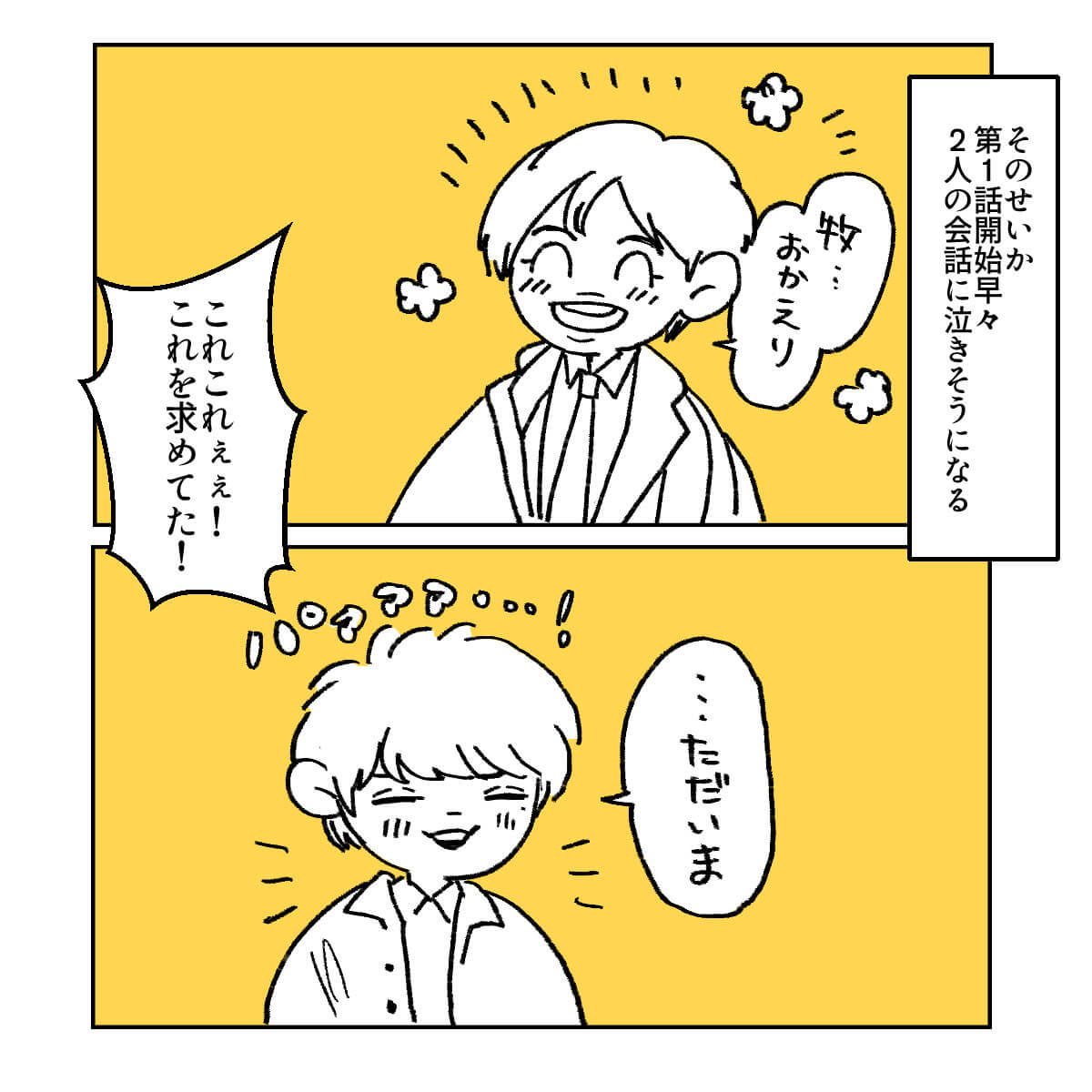 サイゾーウーマン男性アイドルSTARTO(旧ジャニーズ)『おっラブ』1話、春田&牧に大感激! 男性アイドル [ドルオタ漫画家・竜田トキヒロの“推し事”見聞録]vol.39(番外編) 『おっさんずラブ-リターンズ-』1話、ファンが求めていた春田&牧カップルに大感激! 2024/01/11 10:00 竜田トキヒロ(マンガ家) 竜田トキヒロの“推し事”見聞録STARTO ――Twitterで日々、STARTO ENTERTAINMENT(旧ジャニーズ事務所)のタレントをはじめとしたイラストを投稿中のドルオタ漫画家・竜田トキヒロが、現場レポートからドラマや映画、番組レビューまで、“推し事”の様子をお届け! 今回は、“番外編”として、1月5日よりスタートしたドラマ『おっさんずラブ-リターンズ-』(テレビ朝日系)第1話をレビュー! 『おっさんずラブ』は、主人公の会社員・春田創一(田中圭)と春田の上司である部長・黒澤武蔵(吉田鋼太郎)を中心に、男性同士のピュアな恋愛を描いたラブストーリー。2016年12月に単発ドラマが放送されました。 そして18年4月期に連ドラ化し、単発ドラマから引き続き春田と黒澤が登場したほか、エリートサラリーマンの牧凌太(林遣都)が新たに加わり三角関係を繰り広げ、人気が爆発。19年8月には、続編として映画『劇場版 おっさんずラブ ~LOVE or DEAD~』も公開されています。 その後、19年11~12月に連ドラのシーズン2となる『おっさんずラブ-in the sky-』も放送。これは、シーズン1や劇場版とは“別軸”の続編で、物語の舞台が不動産会社から航空会社に変更。春田と黒澤は田中と吉田が続投したものの、林が演じた牧は登場せず、新キャラクターの成瀬竜(千葉雄大)や四宮要(戸次重幸)らと四角関係のラブストーリーを展開しました。 今回の『おっさんずラブ-リターンズ-』では、約5年ぶりにファン待望のシーズン1&劇場版の続編が描かれるということで、春田&牧カップルのファンが大注目! 海外転勤を経て帰国した牧と春田が“新婚生活”を始めた第1話を、シリーズの大ファンである竜田トキヒロがイラストで振り返ります。 『おっさんずラブ-リターンズ-』1話、春田と牧の会話に大感激! 次のページ 『おっさんずラブ-リターンズ-』自堕落な春田にブチギレする牧に思わず共感! 123次のページ 関連記事 『おっさんずラブ』にハマって“73回”映画館に通った!? 『しくじり先生』おかずクラブ・オカリナの“ガチオタ”ぶりに「好感が持てる」の声【2019年映画レビュー】劇場版『おっさんずラブ』に学ぶ、LGBTを“線引き”しないということ『おっさんずラブ-in the sky-』最終回に「脚本がお粗末」「無理やりすぎる」と不満続出のワケSnow Man年越し生配信、「応援しよう」とファンに決意させた目黒蓮の“言葉”関ジャニ∞からSixTONES、Snow Man、ジュニアまで……2023年の現場回顧録