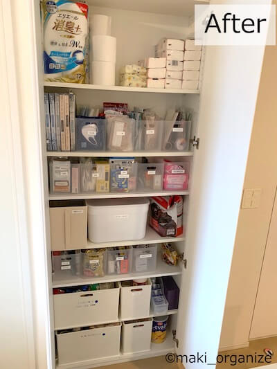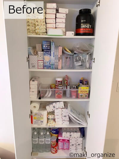 サイゾーウーマン暮らし住まいダイソー330円ボックス 暮らし [連載]女たちの「煩悩部屋」ビフォーアフター 【ダイソー&スタンダートプロダクツ】330円「収納ボックス」が便利! プロの片付け実例は? 2024/01/16 17:00 伊藤まき(収納ライター) 「汚部屋」ビフォーアフター 整理収納アドバイザーの伊藤まきが、片付けに悩む読者の自宅を使いやすく生まれ変わらせる連載シリーズ【「煩悩部屋」ビフォーアフター】。 連載企画『ビフォーアフター』新シーズンです。第8回目の片付けモニターは、江東区・3LDKのマンションで暮らす4人家族のKさん(35歳)。今回は、汚部屋の片付けではなく、都心のマンションに多い狭い収納を使いやすく「手直しする」特別編です。 【ダイソー】330円「フタ付収納ボックス」「R30ボックス」でスッキリ! (上)フタ付収納ボックス(下)R30ボックス(C)maki_organize 前回に続き、今回もダイソーの人気商品を2つ取り上げます。写真の収納ボックスは、ほとんどの店舗で在庫なしが続く人気商品。ニトリと無印良品、イケアで販売されてる収納ボックスと変わらない容量で「半分以上の安さ」なんです! それぞれ、上が「フタ付収納ボックス」、下が「R30ボックス」ですが、よく似ていて、どちらも330円です。 (C)maki_organize 「フタ付収納ボックス」のサイズは2つ。 【H16cm】フタ付収納ボックス(W35.6×D25×H16cm)取手あり JANコード:4549131985689 ※おすすめ【H23cm】フタ付収納ボックス(W35.6×D25×H23cm)取手あり JANコード:4549131985665 「R30ボックス」のサイズも2つ。 【H16cm】R30ボックス(W36.5×D26×H16cm) JANコード:4550480065885 ※おすすめ【H24cm】R30ボックス(W36.5×D26×H24cm) JANコード:4550480065878 では、Kさん宅の「廊下の収納棚」に使った実例を紹介します。 ダイソー「フタ付収納ボックス」軽いものを収納 積み上げているので、開けると雪崩(C)maki_organize 写真上はKさん宅の「廊下収納棚(左側)」です。前回(右側)と同じく、壁にある造り付けの棚で、築浅のマンションに多く見られる収納庫です。この棚も、前回同様にすべて中身を出して、見直して、棚板を増やしてから「収納箱を選び直す」作業をしています。 この棚の奥行きは、ダイソー「R30ボックス」「フタ付収納ボックス」ともに入るサイズなので、入手できるほうを選びました。今回は「フタ付収納ボックス」です。 軽いものの収納専用(C)maki_organize 「フタ付収納ボックス」には、散らばっていた「パーティーグッズ」をイン。重たいモノを詰め込みすぎて、割れてしまったケースも知っているので、紙皿や紙コップなど「軽くてかさばる小物」を「グループ収納」にしてまとめました。扉付きの収納庫なのでふたを外して使ってもOKです。 After 中間の棚、白いボックスがダイソー。透明の箱はダイソー「積み重ね収納ボックス」。最下段の4つの収納箱がニトリ(C)maki_organize 中間の棚にダイソーの「フタ付収納ボックス」を置きました。あまり重たいモノを入れると「板がたわむ心配が出る」ため、収納ボックスも軽いほうが良いです。透明のボックスは、前回取り上げたダイソー「積み重ね収納ボックス」。 棚の最下段とその上段はニトリの「Nインボックス」2サイズを使っています。収納ボックス選びも、使用目的や「材質の強度」で使い方が変わります。 ニトリは重いものを収納(C)maki_organize ニトリ「Nインボックス(旧デザイン)」699円(税込)は、頑丈な作りなので重めの食材入れに使いました。最下段は、棚板の奥行き【D24.4cm】より大きいので【D26.6cm】でも、扉を閉めることができます。 (大)ニトリ「Nインボックス」サイズ(W38.9×D26.6×H23.6cm) 699円(税込)商品コード:8422231 (小)ニトリ「Nインボックス ハーフ」サイズ(W19.2×D26.4×H23.6cm) 599円(税込)商品コード:8422233 ほかにも、プラスチックによる静電気が気になる方で、布モノを入れたい、高さのある棚に入れたいという場合は「布製の330円ボックス」がおすすめです。 次のページ 【スタンダードプロダクツ】330円「布製収納BOX」 12次のページ 関連記事 【ダイソー】150円「積み重ね収納ボックス」でスッキリ! 使いにくい収納棚ビフォーアフター【ダイソー】110円「超強力マグネット」、空中収納に◎! プロの実例アイデア6【ダイソー】330円からの「ワイヤーバスケット(縦)」、キャスター付けると便利! プロの実例3【ダイソー】110円「縦にも横にもはさめる かもいフック」、テーブル上がスッキリ! プロの使用アイデア【ダイソー・セリア】100均だと損する収納グッズ5選! ニトリ・コーナンのほうが安い!