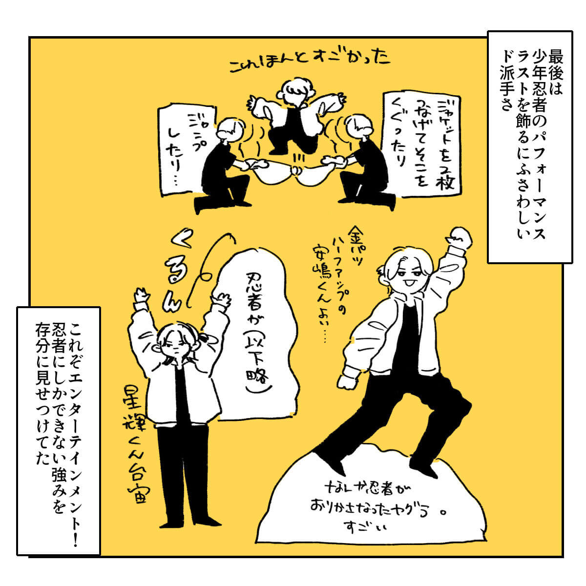 サイゾーウーマン男性アイドル舞台『Act ONE』観劇レポ 男性アイドル [ドルオタ漫画家・竜田トキヒロの“推し事”見聞録]vol.41 舞台『Act ONE』観劇イラストレポ! HiHi Jets・井上&作間のフライングがまるで宗教画 2024/01/25 16:30 竜田トキヒロ(マンガ家) 竜田トキヒロの“推し事”見聞録ジュニアSTARTO 舞台『Act ONE』少年忍者のド派手パフォーマンスは、まさにエンターテインメント! ★これまでの連載記事はこちらから Snow Man年越し生配信、「応援しよう」とファンに決意させた目黒蓮の“言葉”――Twitterで日々、STARTO ENTERTAINMENT(旧ジャニーズ事務所)のタレントをはじめとしたイラストを投稿中のドルオタ漫画家・竜田トキヒロが、現場レポー...サイゾーウーマン2024.01.06 関ジャニ∞からSixTONES、Snow Man、ジュニアまで……2023年の現場回顧録――Twitterで日々、STARTO ENTERTAINMENT(旧ジャニーズ事務所)のタレントをはじめとしたイラストを投稿中のドルオタ漫画家・竜田トキヒロが、現場レポー...サイゾーウーマン2024.01.05 【ジャニオタマンガ】神番組だった『ザ少年倶楽部』ベストパフォーマンスをプレイバック――Twitterで日々、ジャニーズタレントにまつわるイラストを投稿中のジャニオタ漫画家・竜田トキヒロが、現場レポートからドラマや映画、番組レビューまで、“推し事”の様子を...サイゾーウーマン2023.11.22 前のページ123 竜田トキヒロ(マンガ家) 漫画家、イラストレーター。育休中に執筆したエッセイ漫画でKADOKAWAコミックエッセイ大賞受賞。Ameba、ライブドア公式ブロガーを経たのち現在はインフルエンサーとしてエンタメ、オタクに特化した漫画やイラストや体験ルポ等幅広く執筆。著書『コミュ障母さんとごきげん娘』(KADOKAWA) X:@musumenuma 最終更新:2024/01/25 16:33 舞台は今月27日まで! 関連記事 EBiDANの地上波初冠レギュラー番組、超特急・カイのコメントが光る!『おっさんずラブ-リターンズ-』1話、ファンが求めていた春田&牧カップルに大感激!Snow Man年越し生配信、「応援しよう」とファンに決意させた目黒蓮の“言葉”関ジャニ∞からSixTONES、Snow Man、ジュニアまで……2023年の現場回顧録INIのパフォーマンスは新鮮! STARTOアーティストとの違いとは? 次の記事 推しの子実写化、注目集める原作者コメント >