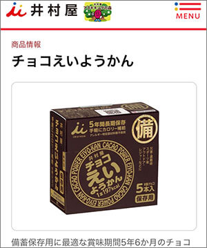 ネット上で「おいしすぎて備蓄できる気がしない」と話題になり、品薄状態が続いている無印良品の「備蓄おやつ チョコようかん」。製造所の表記には「井村屋」とあり、原材料やカロリーも「チョコえいようかん」と同じです。