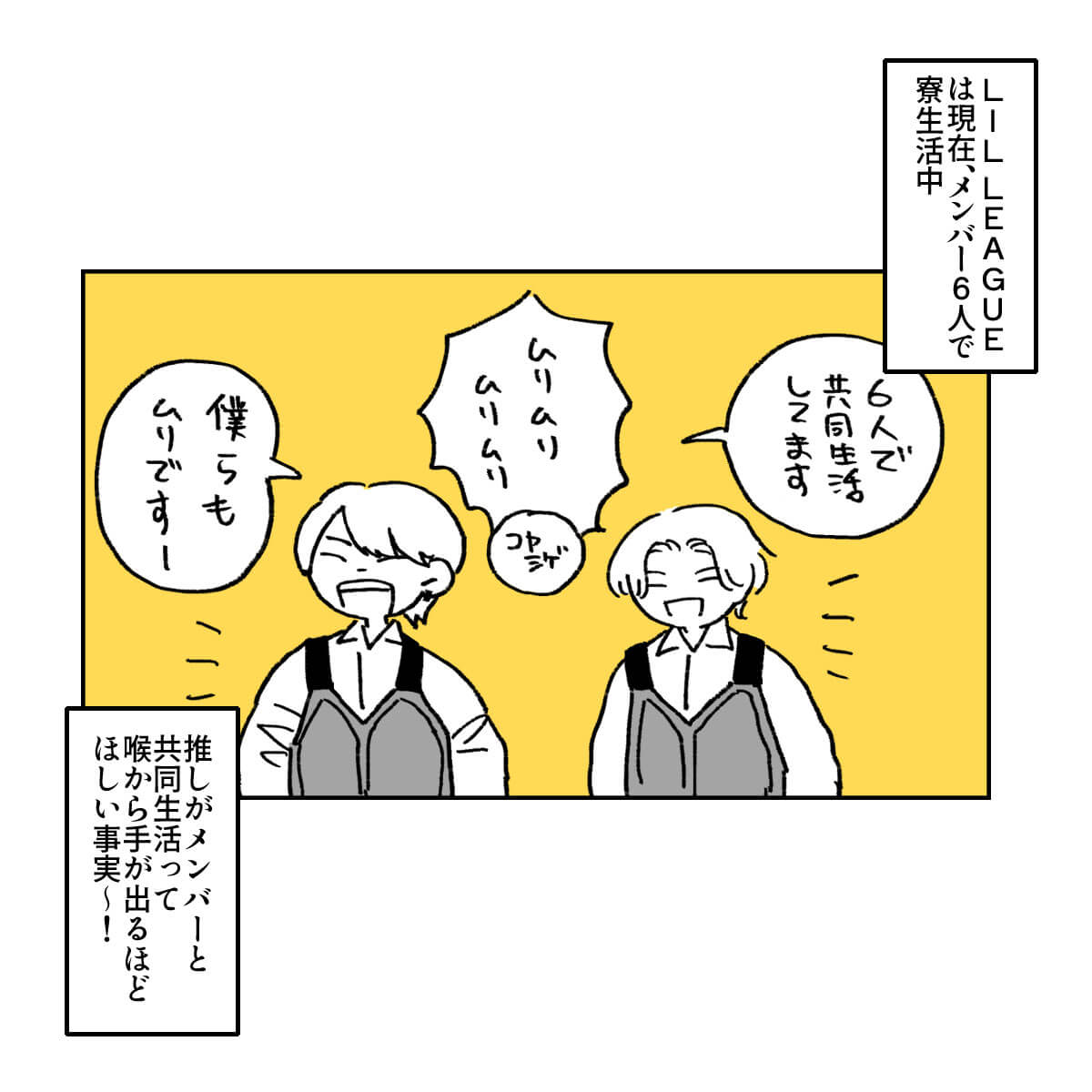 サイゾーウーマン男性アイドルSTARTO(旧ジャニーズ)NEWSNEWSとLIL LEAGUEの未公開トークが秀逸 男性アイドル [ドルオタ漫画家・竜田トキヒロの“推し事”見聞録]vol.45 NEWSの番組にLDH・LIL LEAGUE登場! 未公開トークでの“シゲアキの返し”が秀逸 2024/02/21 21:30 竜田トキヒロ(マンガ家) NEWS竜田トキヒロの“推し事”見聞録LDH ――Twitterで日々、STARTO ENTERTAINMENT(旧ジャニーズ事務所)のタレントをはじめとしたイラストを投稿中のドルオタ漫画家・竜田トキヒロが、現場レポートからドラマや映画、番組レビューまで、“推し事”の様子をお届け! 今回は、2月16日深夜放送されたNEWS・小山慶一郎&加藤シゲアキのレギュラー番組『NEWSの全力!!メイキング』(TBS系)をレビュー! 同番組は、小山と加藤が、「ゼロから作ったら面白そうなモノ」をゲストと共に、片っ端から自作していくDIYバラエティ。2021年4月30日深夜から放送を開始し、STARTO ENTERTAINMENTの後輩はもちろん、これまでさまざまな芸能人、タレントがゲスト出演しています。 また、近頃は他事務所のボーイズグループとの絡みも増えており、昨年12月15、22日放送回には、LDH所属のGENERATIONS from EXILE TRIBEの片寄涼太と関口メンディー、今年1月19、26日放送回には、同じくLDHからFANTASTICS from EXILE TRIBEの世界と中島颯太が登場。これまでなかなか見られなかった共演だけに、SNS上では双方のファンからさまざまな反響を集めました。 今回は、平均年齢16歳というLDHの最年少グループ・LIL LEAGUE from EXILE TRIBE(以下、LIL LEAGUE)の岩城星那と山田晃大が出演した、2月16日深夜放送回をプレイバック。初共演の4人が一体どんなやりとりを見せたのか、イラストで振り返っていきます。 目次 ・NEWSとLIL LEAGUEの年齢差に驚き ・未公開トークでの加藤シゲアキによる“秀逸な返し” 『NEWSの全力!!メイキング』にLIL LEAGUE登場! 20歳の年齢差に驚き 未公開トークで見せた、NEWS・加藤シゲアキによる“秀逸な返し”とは? ★これまでの連載記事はこちらから NEWS・増田貴久、THE RAMPAGE・陣の「兄貴分」? LDHとの飲み会が明らかに NEWS・増田貴久が、11月24日放送のラジオ番組『JUMP UP MELODIES』(TOKYO FM、毎週金曜午後12~14時)にゲスト出演。同番組のパーソナ...サイゾーウーマン2023.11.26 &TEAMとLIL LEAGUEがツートップ! 2024年、編集部員Nが推すボーイズグループ3組 サイゾーウーマン編集部員が週替わりで近況をつづっていく「編集部コラム」。半径1メートルの身近な話からジャニーズや芸能ニュースのネタまで縦横無尽に話題が飛び出します! ...サイゾーウーマン2024.01.05 【LDH|FANTASTICSら7組】2024年の活動予定まとめ(2024年1月15日時点) 数多くのアーティストや俳優、モデル、アスリートを抱える芸能プロダクション・LDH。EXILEをはじめとする男性グループを多数擁し、昨年は新たに「LIL LEAGU...サイゾーウーマン2024.01.15 竜田トキヒロ(マンガ家) 漫画家、イラストレーター。育休中に執筆したエッセイ漫画でKADOKAWAコミックエッセイ大賞受賞。Ameba、ライブドア公式ブロガーを経たのち現在はインフルエンサーとしてエンタメ、オタクに特化した漫画やイラストや体験ルポ等幅広く執筆。著書『コミュ障母さんとごきげん娘』(KADOKAWA) X:@musumenuma 最終更新:2024/02/21 21:30 LDHとの共演、本当に増えたね 関連記事 NEWS・加藤シゲアキ、嵐・大野智と“超最近”に会ったエピソード告白! 交わした“約束”明かすNEWS・増田貴久、THE RAMPAGE・陣の「兄貴分」? LDHとの飲み会が明らかに&TEAMとLIL LEAGUEがツートップ! 2024年、編集部員Nが推すボーイズグループ3組Kis-My-Ft2・千賀健永、八木勇征とも交流アリ! LDH勢との幅広い交友関係明らかに【LDH|FANTASTICSら7組】2024年の活動予定まとめ(2024年1月15日時点) 次の記事 Snow Manが圧倒的トップ、前週1位OWVは? >