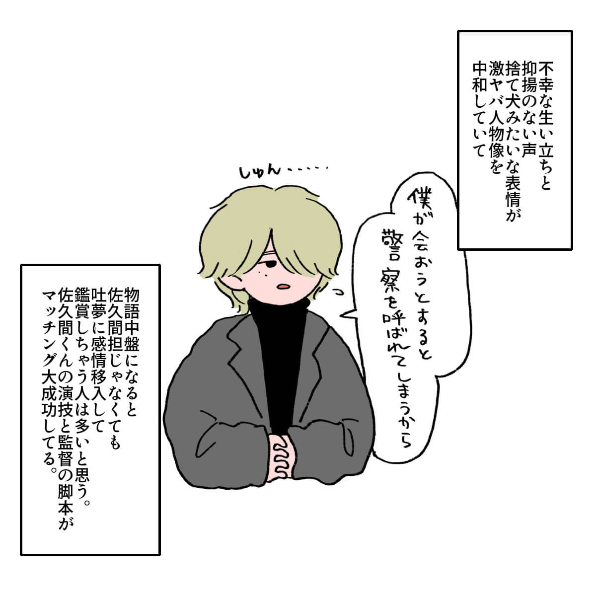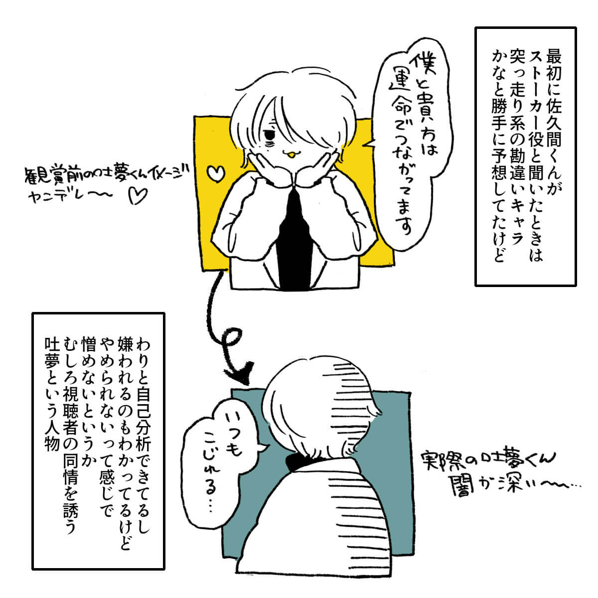 サイゾーウーマン男性アイドルSTARTO(旧ジャニーズ)Snow Man佐久間大介『マッチング』で佐久間が可愛いシーンとは? 男性アイドル [ドルオタ漫画家・竜田トキヒロの“推し事”見聞録]vol.47 映画『マッチング』、Snow Man・佐久間大介ファンが「可愛くて叫びそうになった」シーンとは? 2024/03/06 21:15 竜田トキヒロ(マンガ家) Snow Man佐久間大介竜田トキヒロの“推し事”見聞録 ――Twitterで日々、STARTO ENTERTAINMENT(旧ジャニーズ事務所)のタレントをはじめとしたイラストを投稿中のドルオタ漫画家・竜田トキヒロが、現場レポートからドラマや映画、番組レビューまで、“推し事”の様子をお届け! 今回は、土屋太鳳主演、Snow Man・佐久間大介出演映画『マッチング』をレビュー! この映画は、草なぎ剛主演映画『ミッドナイトスワン』(2020年9月25日公開)やHey!Say!JUMP・山田涼介主演の『サイレントラブ』(24年1月26日公開)を手掛けた内田英治氏が原作・脚本・監督を務めた完全オリジナルの新感覚サスペンス・スリラー作品。 マッチングアプリを題材に、“出会い”の裏に仕掛けられた恐怖を描いた物語で、ウェディングプランナーとして働く傍ら、プライベートでは恋愛音痴な主人公・唯島輪花を土屋太鳳が演じています。 また佐久間は、輪花とアプリでマッチングする狂気のストーカー・永山吐夢役で出演。そのほか、ロックバンド・RIZEのドラマーで俳優・金子ノブアキをはじめ、片山萌美、真飛聖、杉本哲太、斉藤由貴ら実力派キャスト陣が脇を固めています。 予告映像が解禁された時点から、ネット上では「こういう佐久間くんが見たかった!」「公開が待ち遠しい」と期待の声が上がっていた今作。実際に劇場に足を運んだ人からは「佐久間くんの演技がよかった」「吐夢に惹きつけられた」などと好意的な感想が寄せられており、映画レビューサイト「Filmarks」では「星3.7」と、まずまずの評価を得ています(3月6日午後7時時点)。 この記事では、佐久間が劇中でどんな演技を見せていたのか、イラストで紹介していきます! ※以下、映画のネタバレを含みますのでご注意ください。 目次 ・Snow Man・佐久間大介のギャップがすごい ・佐久間大介の演技と脚本が「マッチング大成功」! ・佐久間担的、吐夢の可愛いシーン Snow Man・佐久間大介、マッチングアプリ内と現実のギャップがすごい Snow Man・佐久間大介の演技と内田監督の脚本が「マッチング大成功」! 佐久間担的、吐夢が「可愛くて叫びそうになった」シーンとは? ★これまでの連載記事はこちらから Snow Man・佐久間大介出演『マッチング』、今年のSTARTO勢映画4作でトップに 女優・土屋太鳳が主演を務め、Snow Manの佐久間大介がメインキャストの1人として出演している映画『マッチング』が、2月23日に公開初日を迎えた。26日発表の国...サイゾーウーマン2024.02.27 Snow Man年越し生配信、「応援しよう」とファンに決意させた目黒蓮の“言葉”――Twitterで日々、STARTO ENTERTAINMENT(旧ジャニーズ事務所)のタレントをはじめとしたイラストを投稿中のドルオタ漫画家・竜田トキヒロが、現場レポー...サイゾーウーマン2024.01.06 竜田トキヒロ(マンガ家) 漫画家、イラストレーター。育休中に執筆したエッセイ漫画でKADOKAWAコミックエッセイ大賞受賞。Ameba、ライブドア公式ブロガーを経たのち現在はインフルエンサーとしてエンタメ、オタクに特化した漫画やイラストや体験ルポ等幅広く執筆。著書『コミュ障母さんとごきげん娘』(KADOKAWA) X:@musumenuma 最終更新:2024/03/06 21:15 気になった方はぜひ劇場へ 関連記事 Snow Man・岩本照&佐久間大介、「服につけてる」互いの“匂い”の印象語る嵐・松本潤は「すっごい褒めてくれた」――Snow Man・佐久間大介ら後輩がエピソード披露宮舘涼太の完璧な「マツケンサンバ」、佐久間大介の“残像”――『それスノ』ダンス企画プレイバックSnow Man・佐久間大介出演『マッチング』、今年のSTARTO勢映画4作でトップにSnow Man・佐久間大介、VTuber・星街すいせいとの“交際疑惑”否定もファン幻滅 次の記事 シゲアキの“プロ意識”に称賛の声上がるワケ >