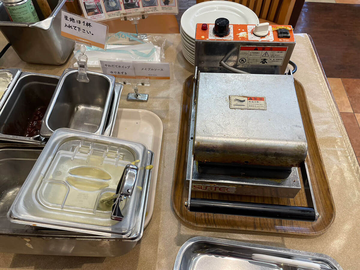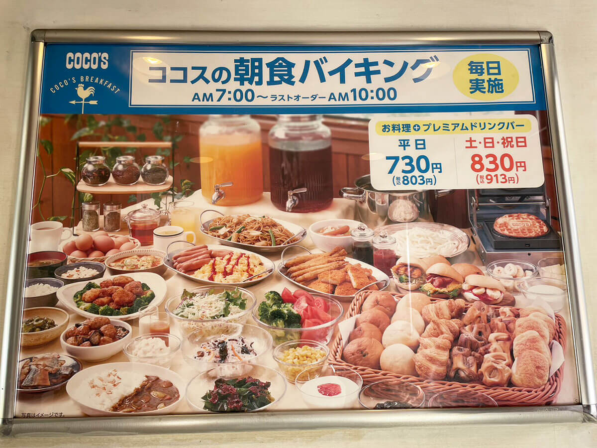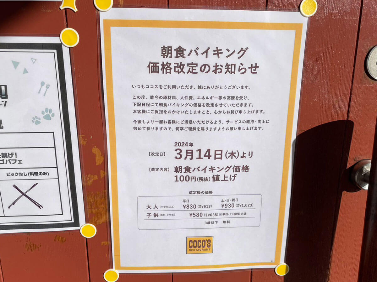 サイゾーウーマン暮らし食べ物ココスの朝食バイキングが値上げ 暮らし モーニング食べ比べレビュー 【ココス】赤字から復活に納得! 803円の朝食バイキングは満足度◎、3月14日~の値上げ前に急げ!! 2024/03/12 16:00 サイゾーウーマン編集部(@cyzowoman) モーニング食べ比べレビューココス ココスの外観と朝食バイキングの横断幕(C)サイゾーウーマン ファミリーレストランチェーンの店舗数で、ガスト、サイゼリヤ、ジョイフルに次いで全国4位の“ココス”。 「料理のクオリティが高い」という声も聞かれるココスですが、2019年には赤字に転落し、翌年にジャスダック上場廃止。同年、株式交換により日本レストランホールディングス(ゼンショーホールディングスの子会社)の完全子会社となって以降は、サービスなどを見直して復活を遂げたようです。 そんな紆余曲折あったココスですが、一部店舗で実施している“朝食バイキング”が好評だとか。実際に足を運び、人気の秘密を探ってきました。 ※価格はすべて税込。 ※価格や商品は2024年3月10日時点の情報です。 ※最新の情報は公式サイトや公式SNSをご確認ください。 ※店舗によって取り扱い商品が異なります。 目次 ・ココス朝食バイキングの価格 ・料理をチェック! ・朝食バイキングを実食! ・【結論】パンはマストでコスパ◎ ココスの朝食ブッフェ、3月14日から110円値上げ! 朝食バイキングの案内ポスター(C)サイゾーウーマン ココスの朝食バイキングは、午前7~10時(ラストオーダー)まで注文可能。90分間の時間制で、和洋中の料理に加え、プレミアムドリンクバーもついてきます。 ただ、実施店舗が限られている上、土日祝限定で行っている店舗も多いため、初めて行く際には事前に公式サイトの情報を確認することをおすすめします。 え!(C)サイゾーウーマン というわけで早速、最寄りの店舗へ。すると、入り口のドアに「朝食バイキング 価格改定のお知らせ」なる不穏な張り紙が……。どうやら昨今の材料費や人件費、光熱費の高騰を受けて、3月14日より110円の値上げに踏み切るようです。 ココス朝食バイキングの価格 【現在】 大人:平日803円、土日祝913円。 4歳~小学生:580円(平日・土日祝共通) 3歳以下:無料 【改定後】 ※2024年3月14日~ 大人:平日913円、土日祝1,023円。 4歳~小学生:638円(平日・土日祝共通) 3歳以下:無料 このご時世、商品の値上げは仕方ないものの、朝食にかかる値段が1,000円を超えると印象は大きく異なります。これを機に足が遠のいてしまうお客さんもいるでしょうから、ココスも苦渋の決断だったのでしょうね。 そんな予期せぬ貼り紙にショックを受けつつ、レジで料金を前払いしてテーブルにつきます。 ココス朝食バイキング803円、料理をチェック! さて、気を取り直して料理のラインナップを見ていきましょう! 新鮮野菜が並ぶサラダコーナー(C)サイゾーウーマン ほかほかの五目混ぜご飯(C)サイゾーウーマン 白米と定番のカレー(C)サイゾーウーマン トースターで焼けるパンコーナー(C)サイゾーウーマン ししゃもフライとから揚げ(C)サイゾーウーマン 上から、ソース焼きそば、鶏団子と茄子の照り焼きソース和え、さば味噌煮(C)サイゾーウーマン ふわふわのスクランブルエッグ(C)サイゾーウーマン 豆乳味噌うどん(C)サイゾーウーマン コーンスープとみそ汁(C)サイゾーウーマン スティック大学芋、納豆、生卵(C)サイゾーウーマン 自分で焼けるワッフルコーナー(C)サイゾーウーマン 撮りきれていないものもありますが、だいたいこんな感じでした。 通常なら単品429円のプレミアムドリンクバーもついているので、コスパ的には十分すぎるラインナップといえるのではないでしょうか。 ココスの朝食バイキングを実食! 焼き立てパンが最高 いただきます!(C)サイゾーウーマン 優しい味の豆乳味噌うどん(C)サイゾーウーマン おなかに卵が詰まったししゃもフライ(C)サイゾーウーマン 揚げ茄子にソースが絡んだ“鶏団子と茄子の照り焼きソース和え”(C)サイゾーウーマン カレーやスクランブルエッグ、ソーセージといった定番メニューだけでなく、“豆乳味噌うどん”や“ししゃもフライ”といった朝食ブッフェでは珍しいメニューも。豆乳味噌うどんは優しい味で、朝食に最適。ししゃもフライは揚げたてでサクサクです。 個人的には、“鶏団子と茄子の照り焼きソース和え”が一番のヒット! ご飯が何杯でもいけそうな味でした。 パンは4種類、“月替わりパン”は要チェック! バジルパンにマーガリンをつけて(C)サイゾーウーマン ココスの朝食バイキングは「お店で焼き上げたパンが自慢」(公式サイトより)とのこと。この日のパンコーナーには、クロワッサン、デニッシュ、ソフトフランスに加え、“月替わりパン”だというバジルパンがありました。 焼き立てのクロワッサンもおいしかったのですが、バジルパンが大人向けの味で大ヒット! トーストするとバジルの香りが一層引き立ち、リッチな味わいです。 デザートはワッフルがおすすめ! 焼き